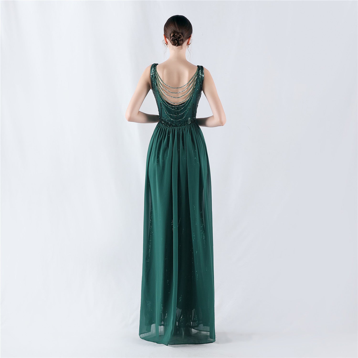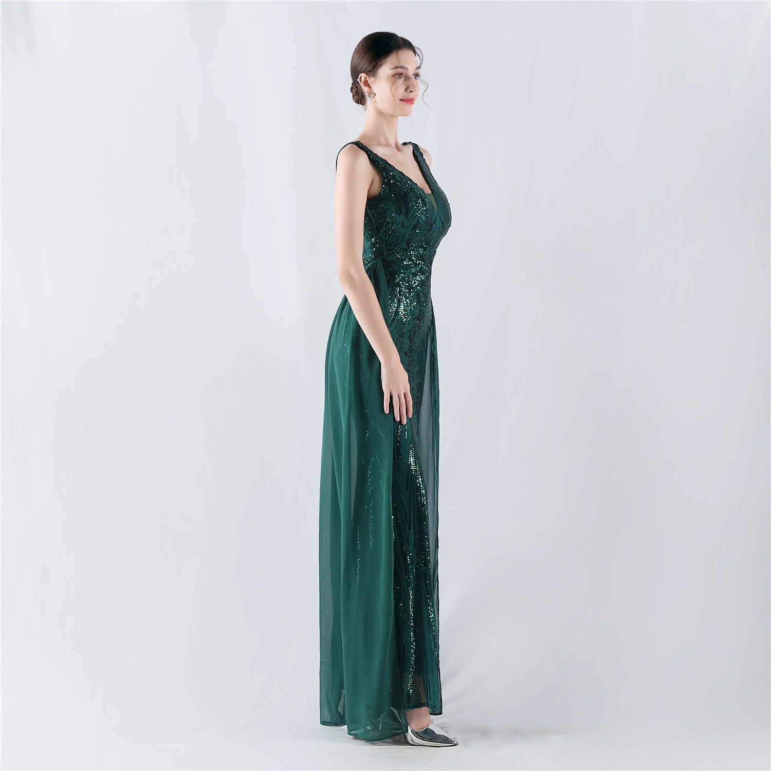 Indulge in opulent luxury with Aureate/Green, the perfect choice for a formal event or gala. The deep emerald green hue exudes glamour, while the fitted, sequined bodice catches the light with intricate patterns. The V-neckline and chiffon overlay add allure and elegance to this stunning floor-length silhouette. Elevate your style and make a statement with Aureate/Green.