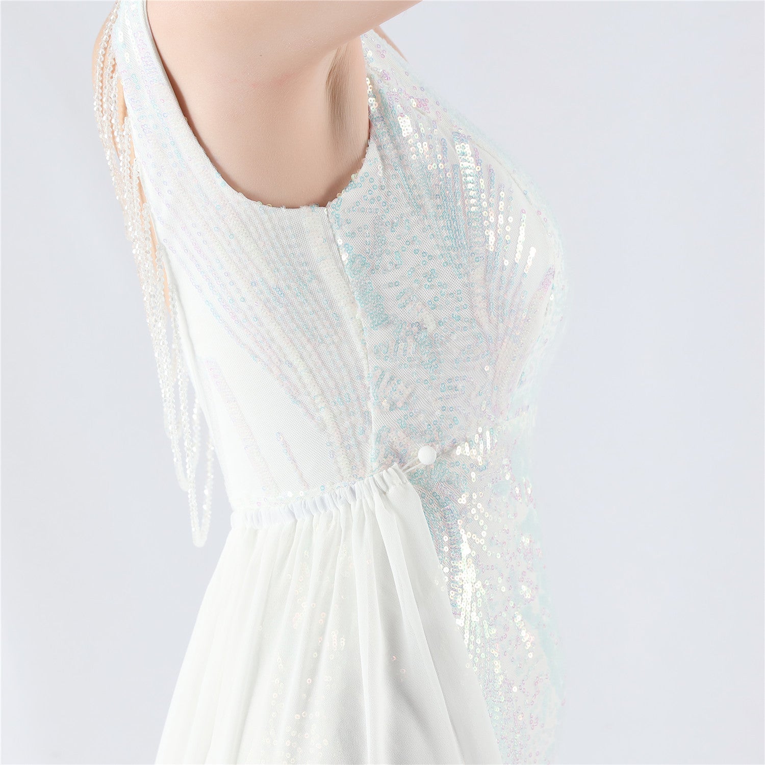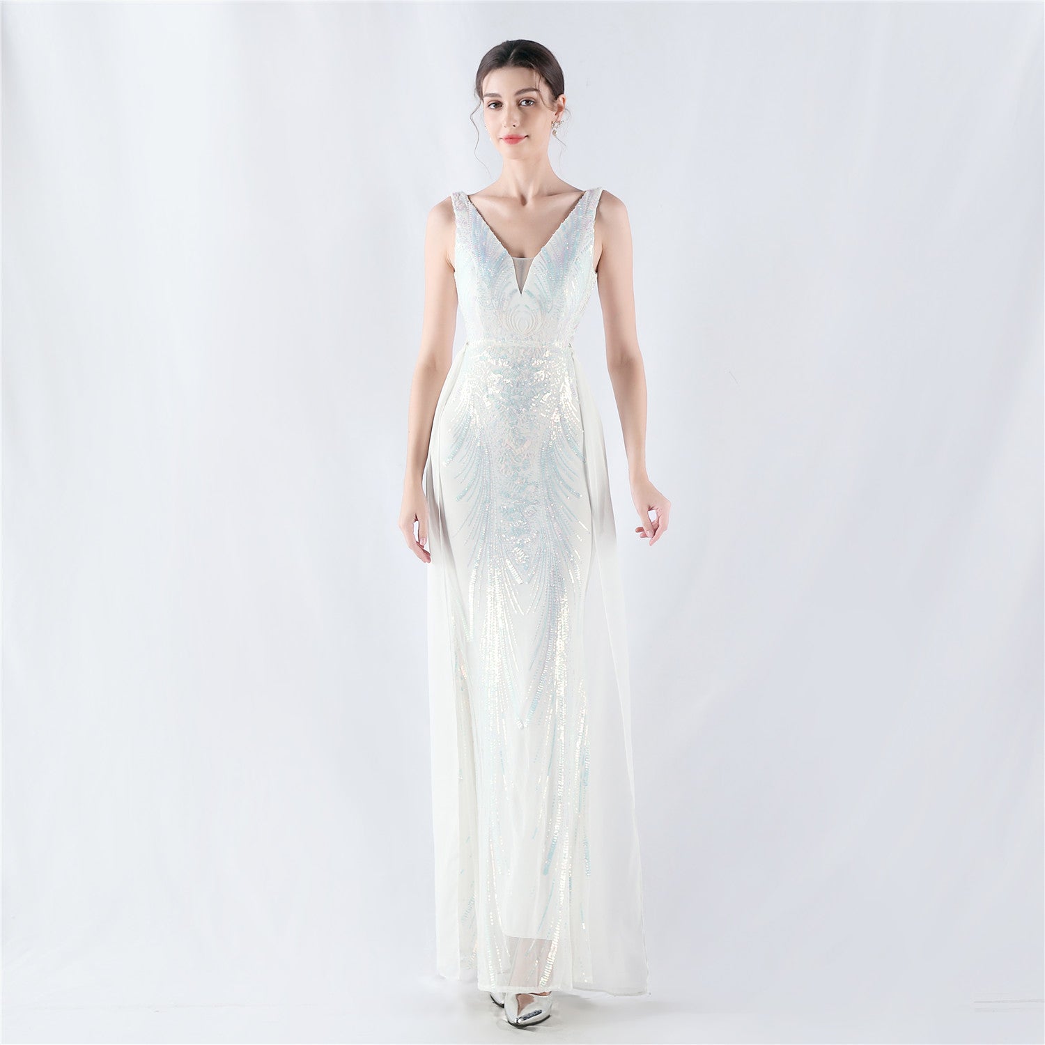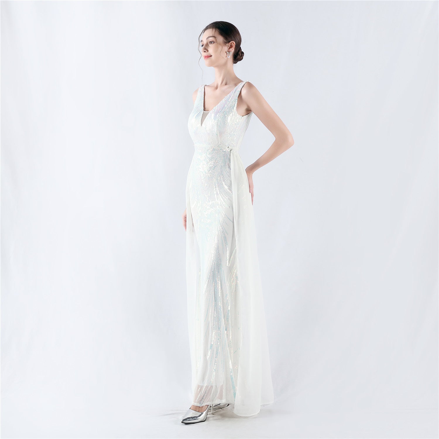 Discover the perfect blend of elegance and modern flair with the Aureate/White Sequin V-Neck Evening Gown with Cape. This breathtaking floor-length gown features intricate sequin embellishments that cascade down the bodice and skirt, creating a dazzling, ethereal glow. The detachable cape adds a dramatic touch and offers a versatile style option. Crafted from premium sequin-embellished fabric, this gown ensures comfort and luxury for any special occasion. Elevate your presence and exude sophistication with this must-have gown.