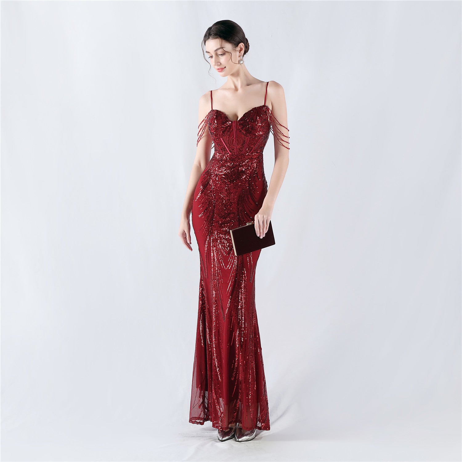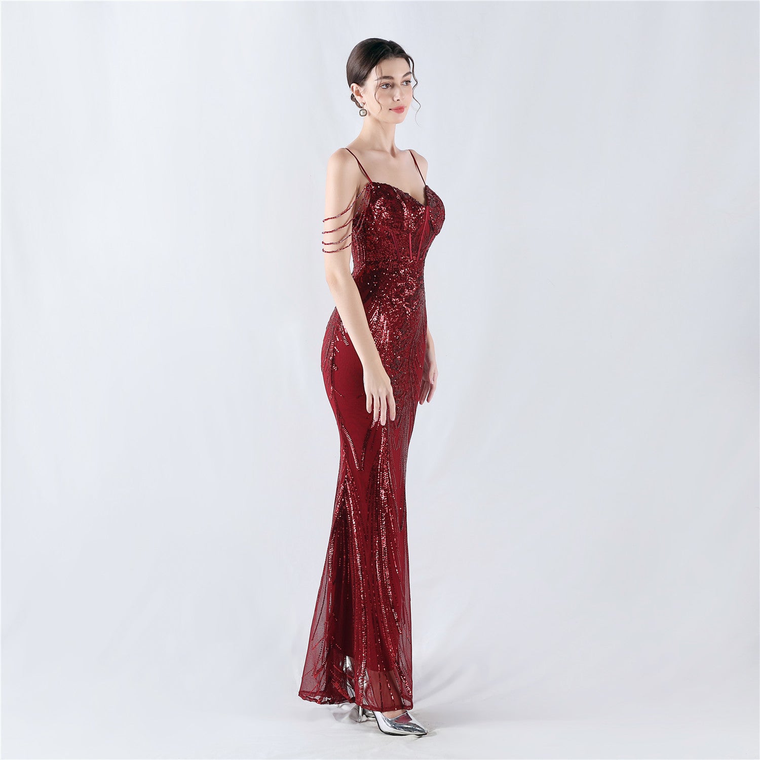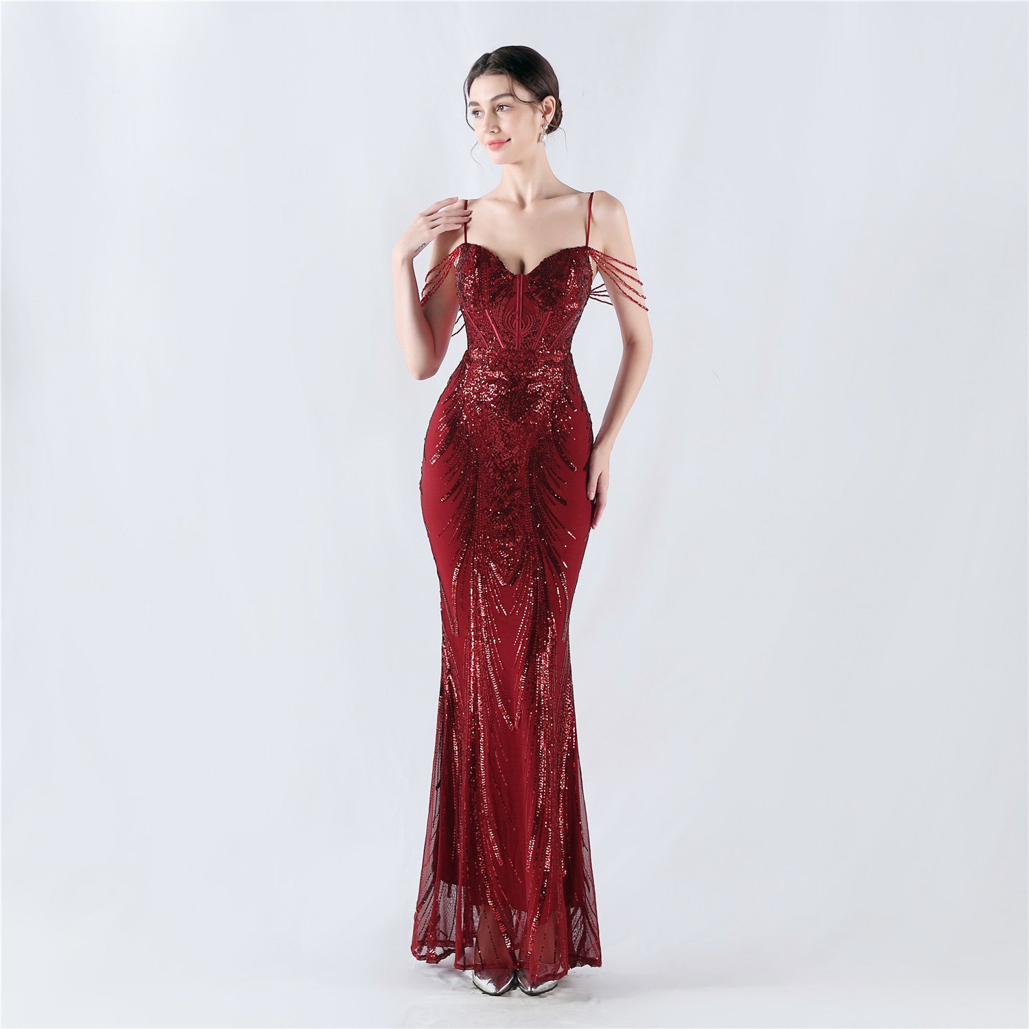 Step into the spotlight with Celestia/Burgundy, a show-stopping sequined mermaid gown that exudes bold glamour and elegance. Delicate spaghetti straps with intricate bead embellishments complement the deep V-neckline for a touch of sparkle and sophistication. The fitted bodice and floor-length skirt with a subtle train create a modern twist on the classic mermaid silhouette. Ideal for prom or red-carpet events.