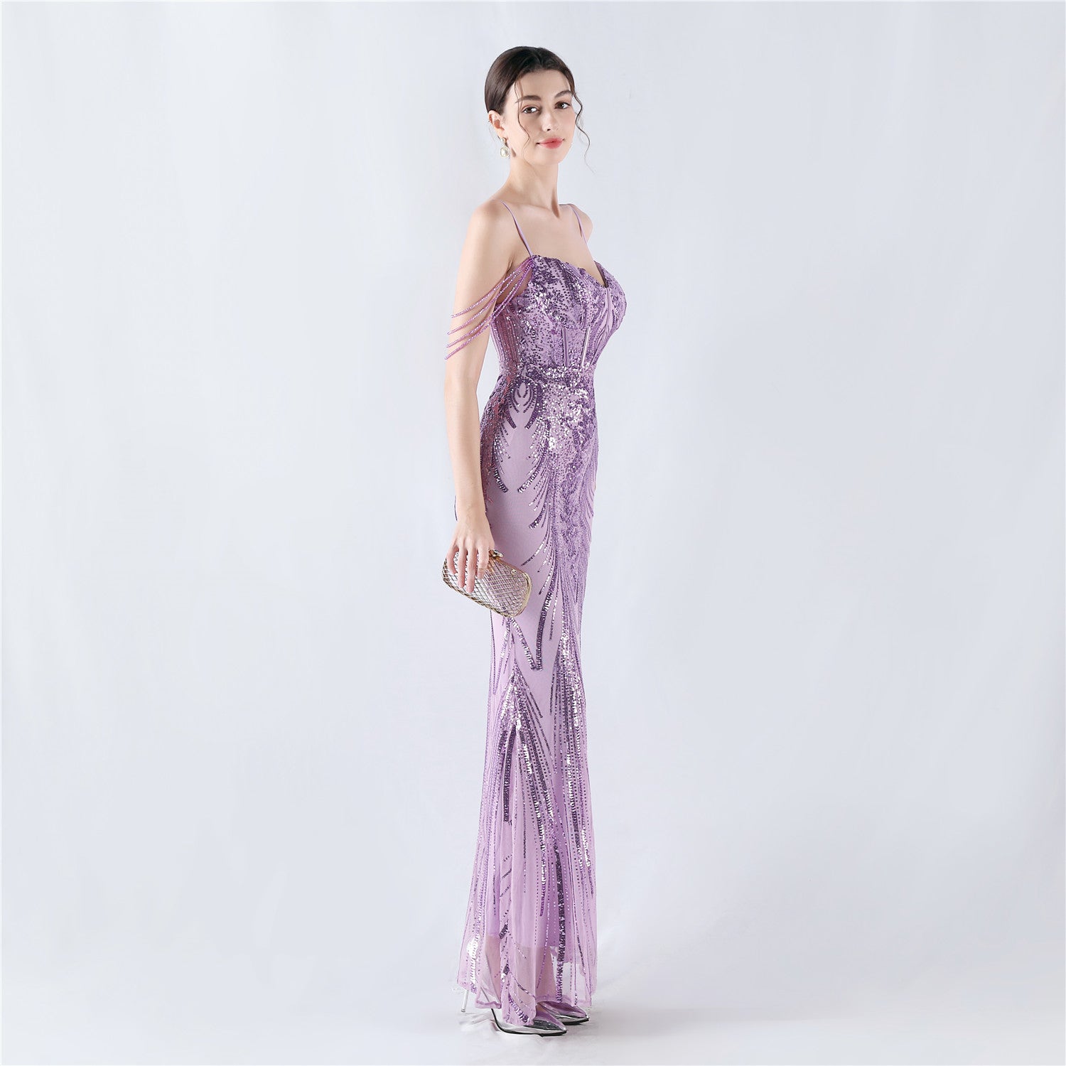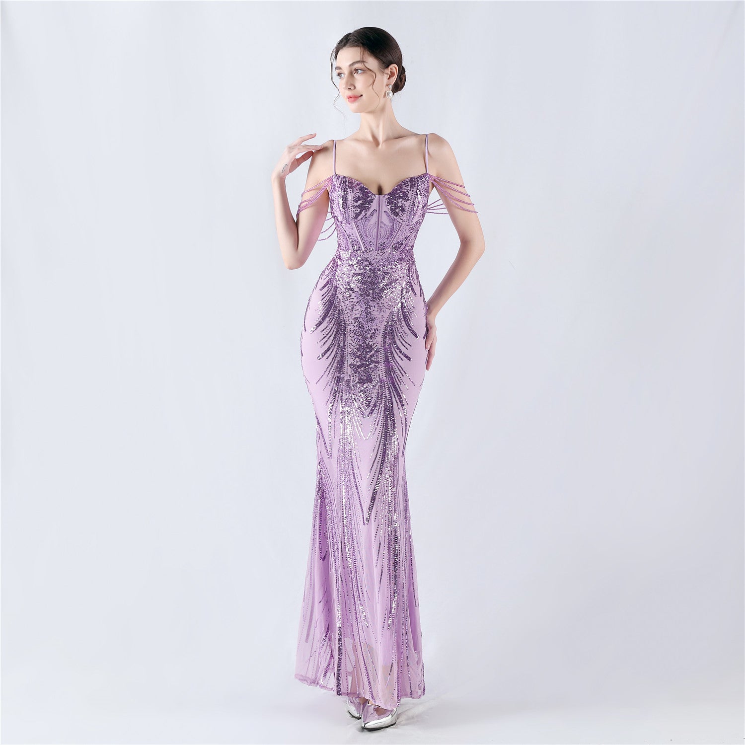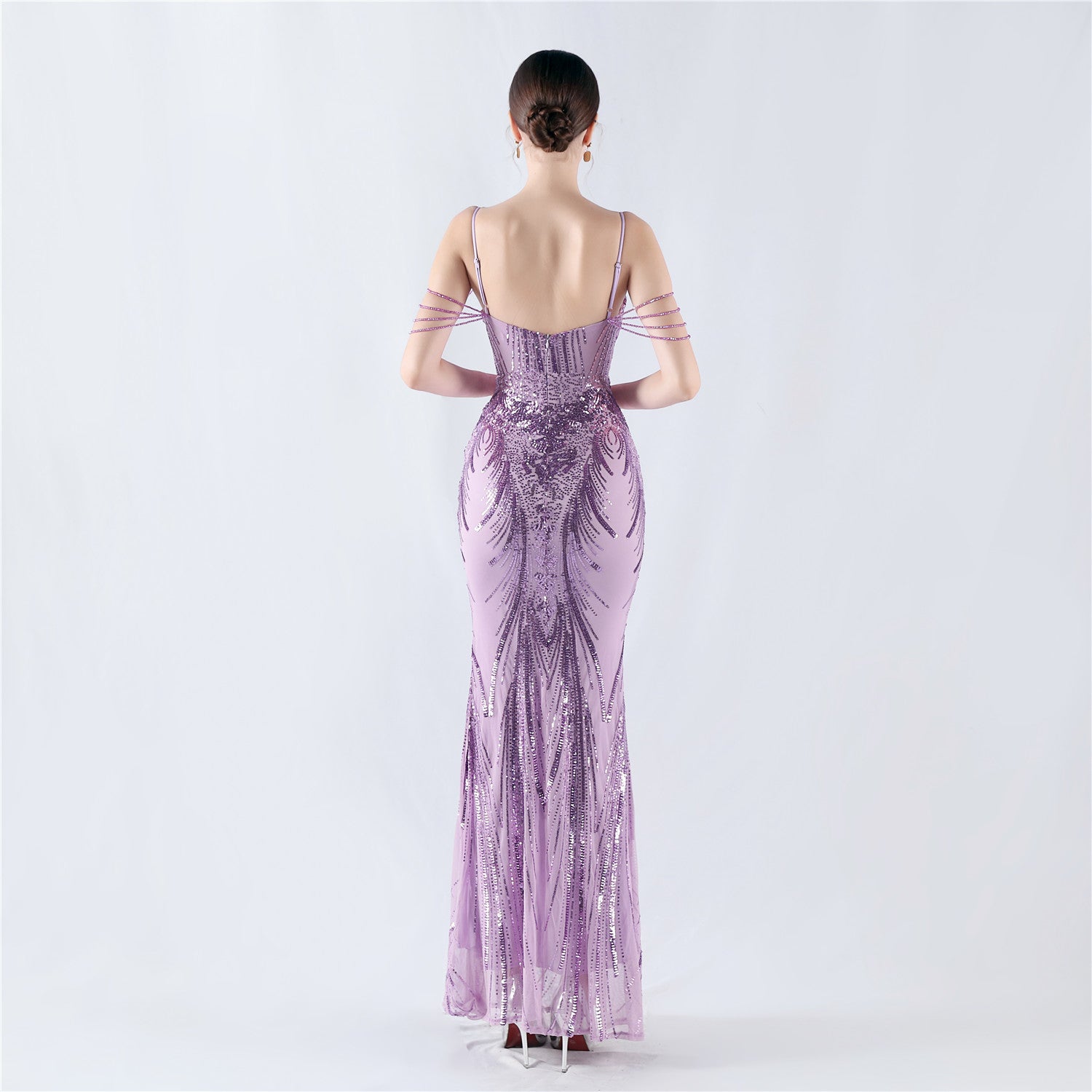 Step into the spotlight with Celestia/Purple, a glamorous floor-length gown in shimmering lavender. This fitted mermaid silhouette features intricate sequin embellishments in a feather-like pattern, creating a subtle sparkling effect. The deep V-neck bodice and off-the-shoulder detailing exude elegance, while the subtle train at the hem adds a touch of modernity. Perfect for prom, galas, or any red-carpet event when paired with metallic silver heels.
