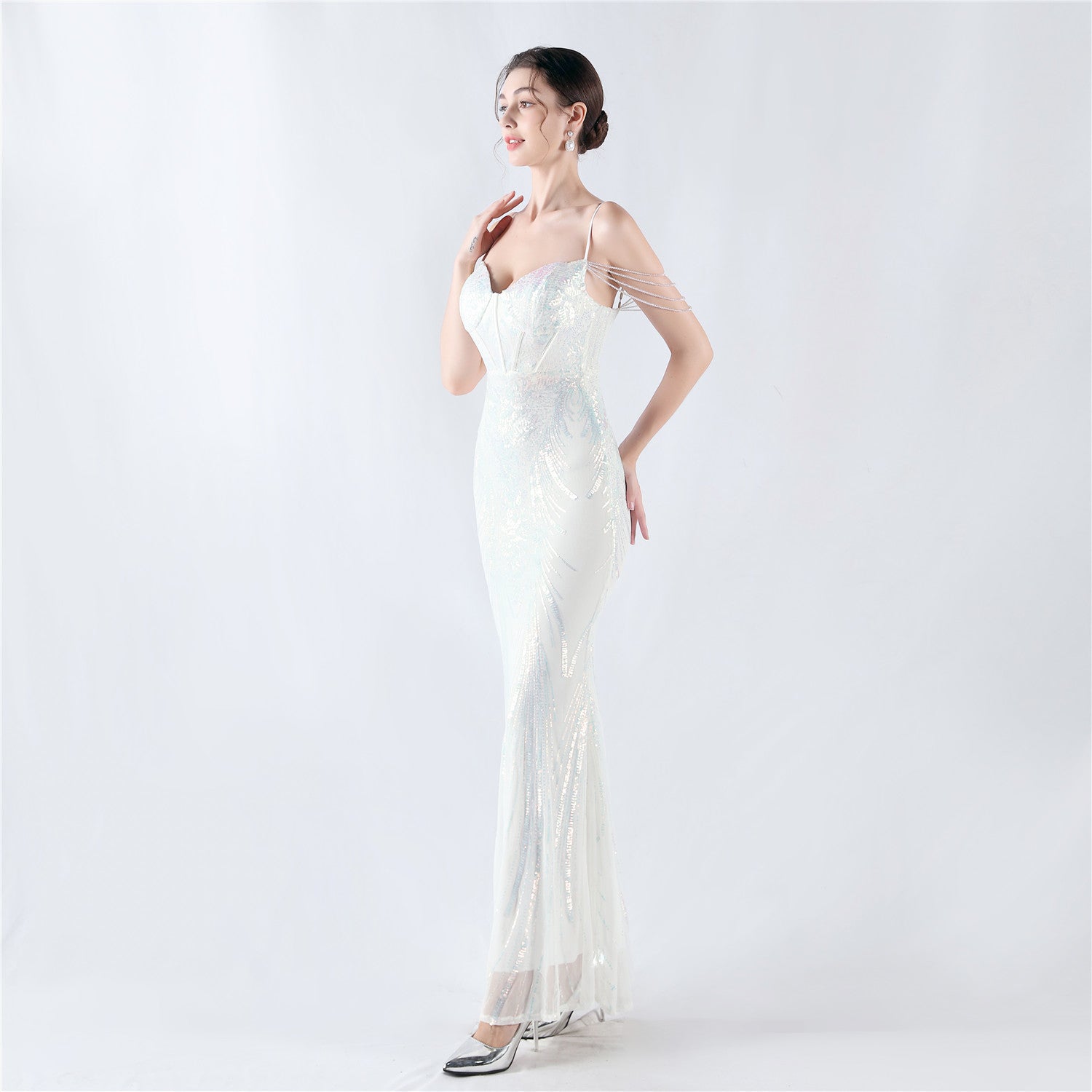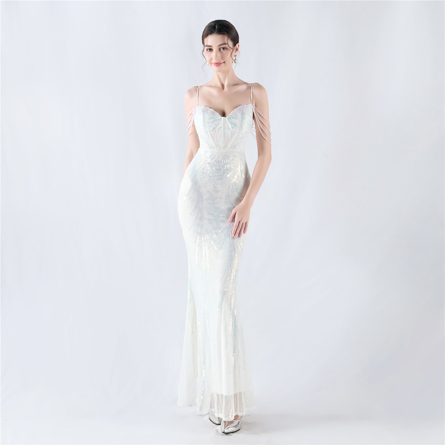 Elevate your style with Celestia/White, a stunning silver sequined mermaid gown that exudes timeless glamour and modern sophistication. With delicate spaghetti straps and cascading bead embellishments, this dress adds movement and sparkle to your look. The deep V-neckline and fitted bodice show off your curves, while the all-over sequin design reflects light for a mesmerizing iridescent effect. Perfect for prom, formal galas, or any special occasion where you want to shine like a star.