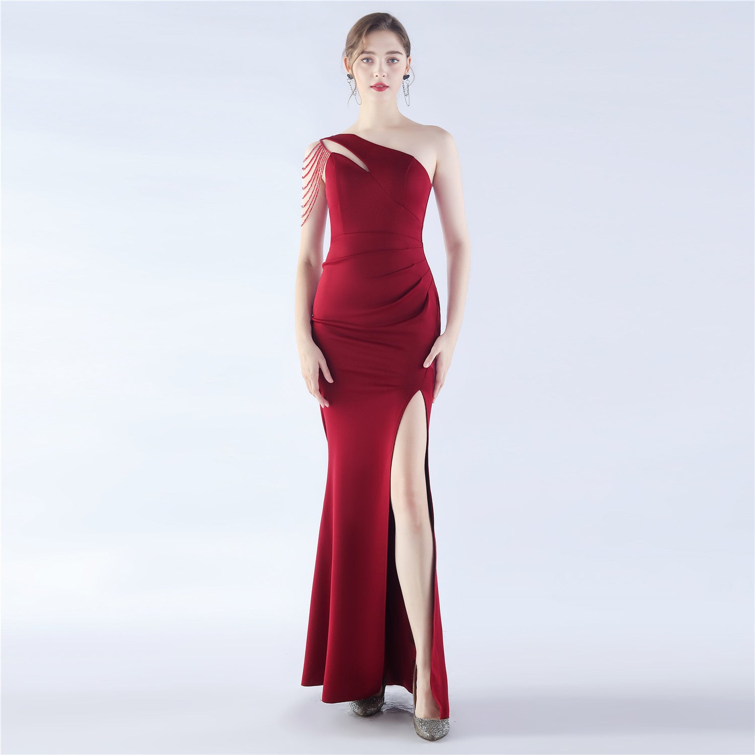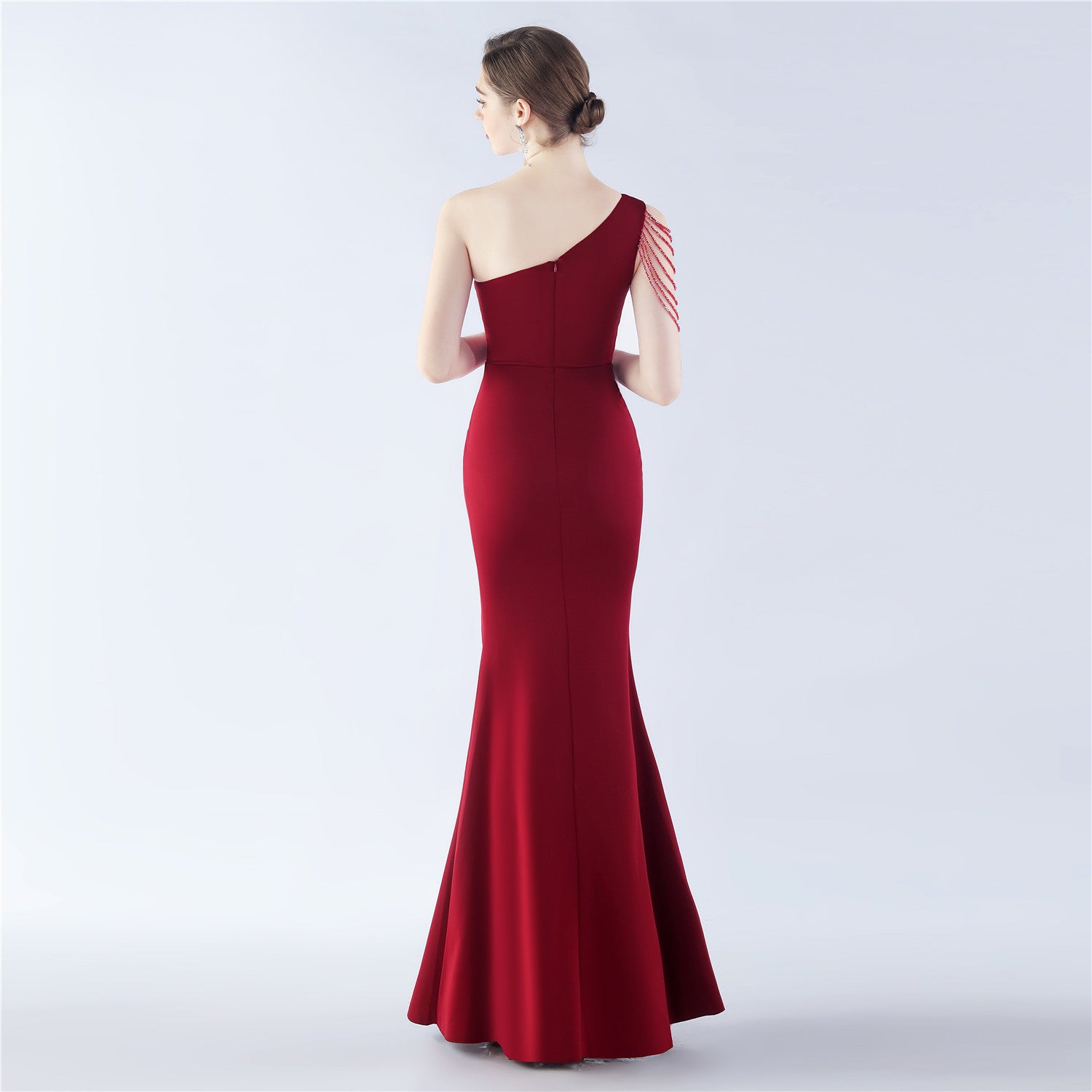 As a fashion expert, I present to you Crimson, a luxurious plus-size dress perfect for any formal occasion. This stunning piece features a deep red fabric and a one-shoulder design with intricate, draped chains for a touch of glamour. Designed to flatter plus-size figures, the dress includes a form-fitting silhouette that leads to a dramatic high slit.