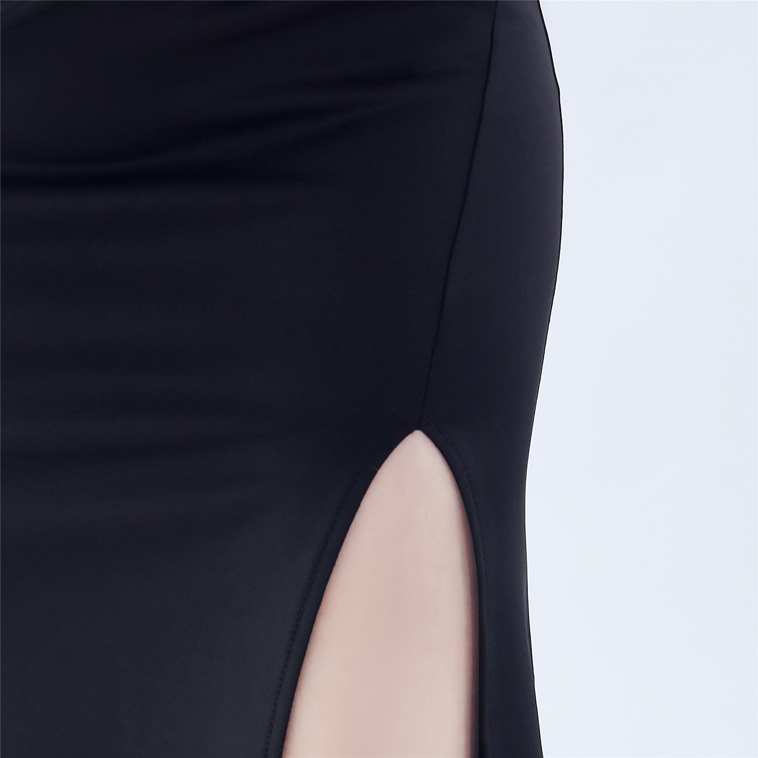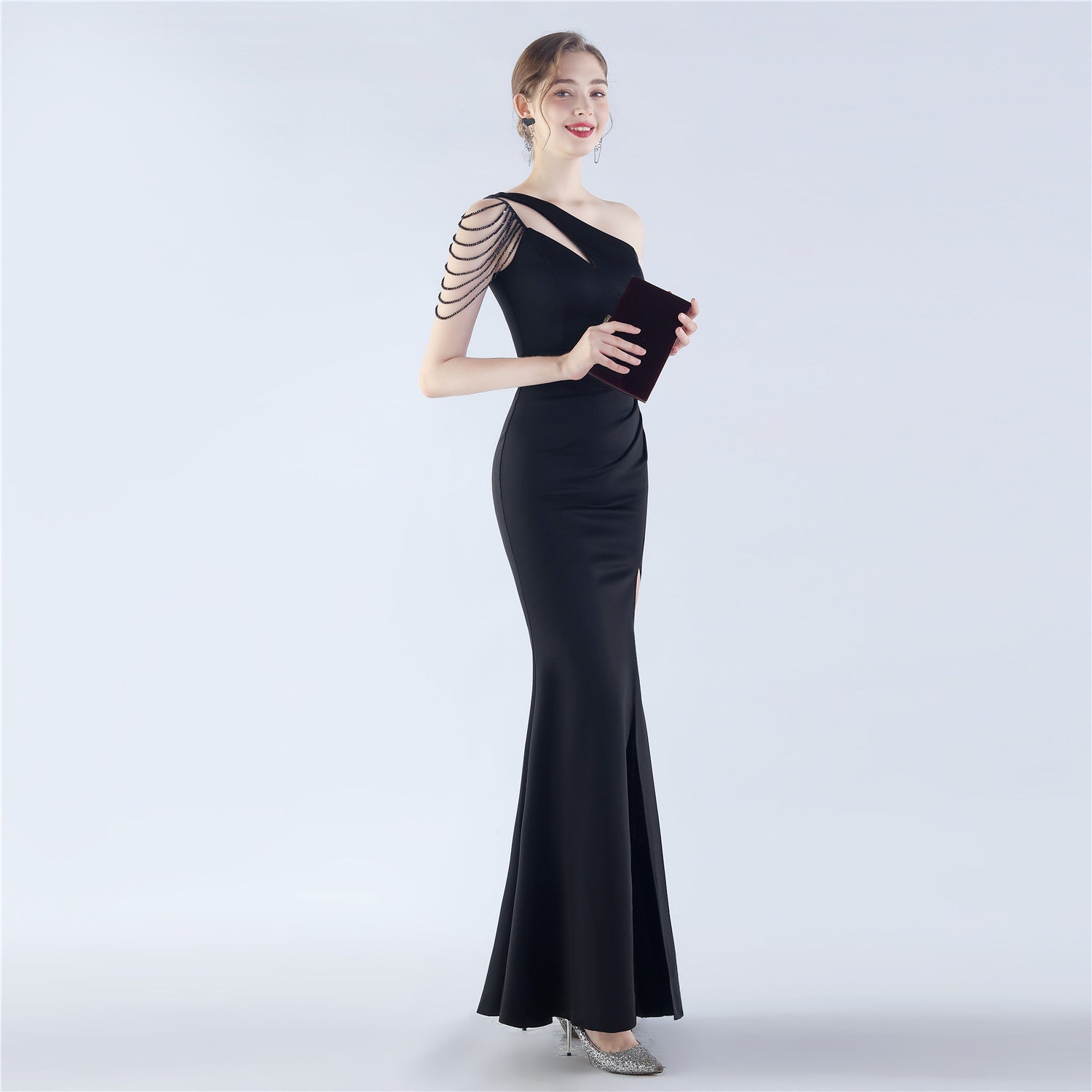 As a formalwear expert, we present to you our sleek black evening gown. Designed with a one-shoulder silhouette and asymmetrical cutout, it's sure to turn heads. The draped bodice enhances the figure while the delicate chain embellishments add glamour. With a high slit for movement and made from form-fitting fabric, this dress will guarantee a stunning and unforgettable look.