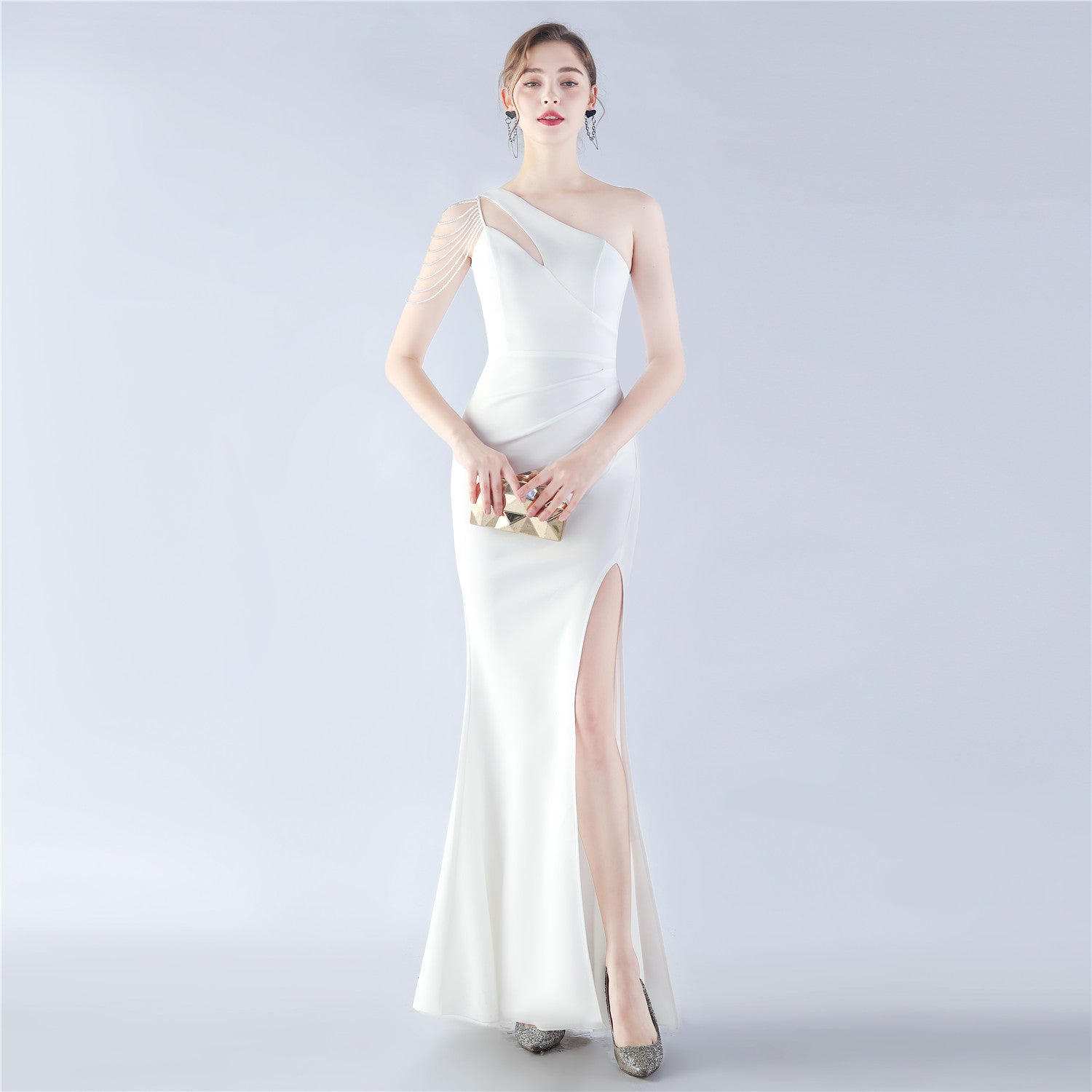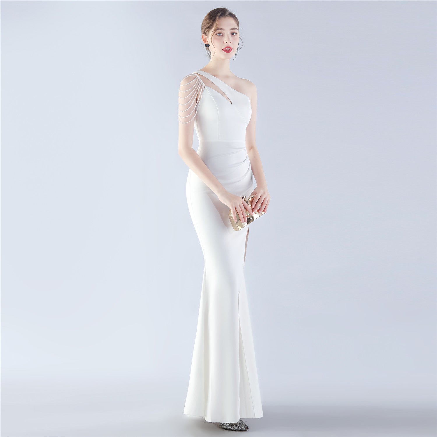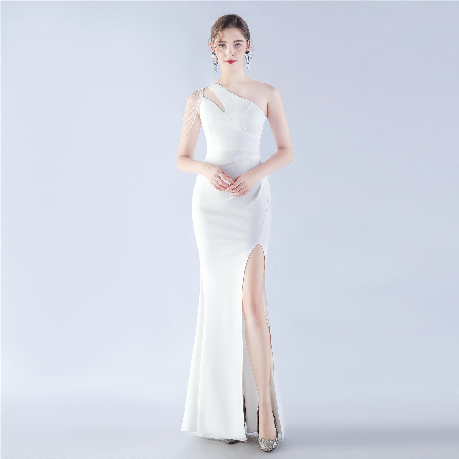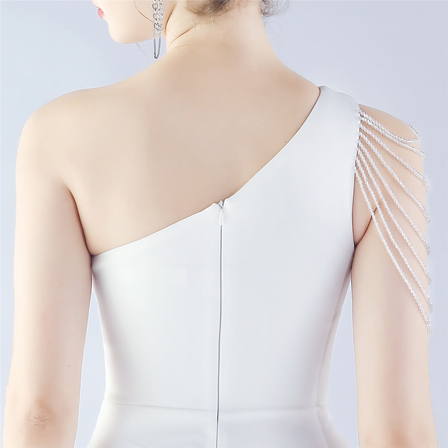 Exude confidence in our Crimson/White evening gown. The modern, one-shouldered design features a chic cutout detail and delicate chain embellishments. With a fitted silhouette and high thigh slit, this dress showcases your figure while adding a touch of allure. Complete the look with statement earrings and silver heels. Luxurious fabric and sleek design make this dress a standout choice.