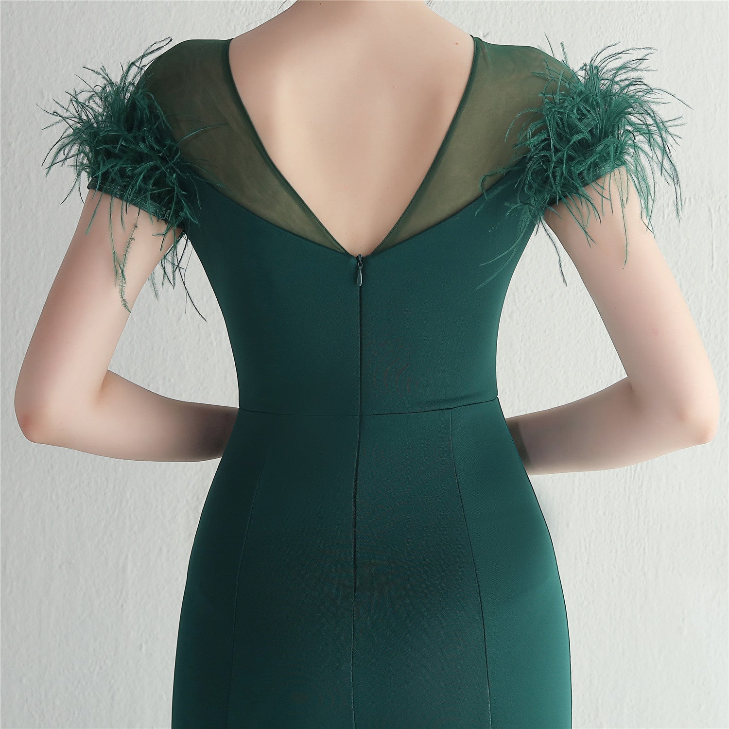 Indulge in the opulence of Emerald Enchantress, a brilliant fusion of charm and allure. This stunning emerald green gown boasts a figure-flattering silhouette and exquisite embellishments on the sheer neckline. Vintage feathered accents and a daring high slit complete the look of refined elegance. Perfect for formal occasions, this floor-length masterpiece exudes timeless luxury.