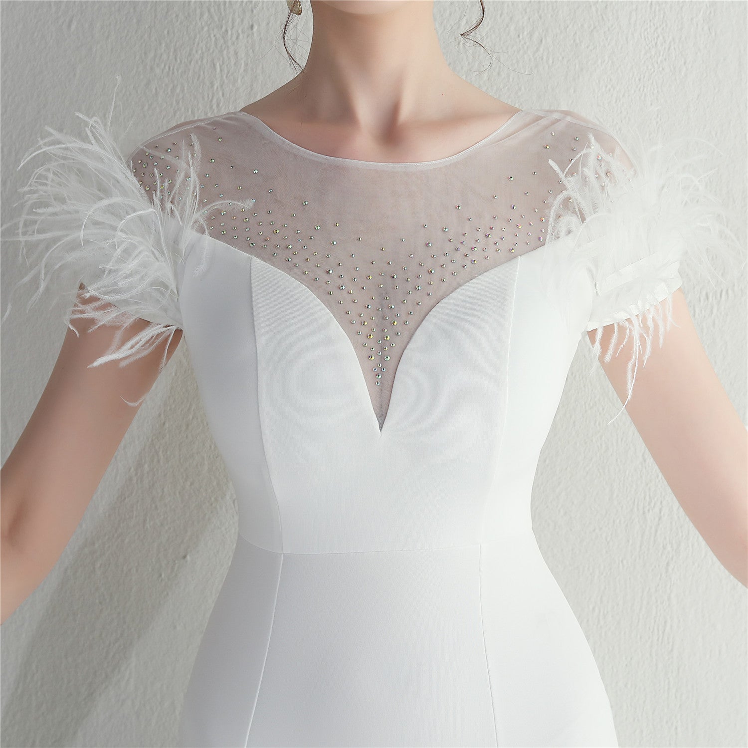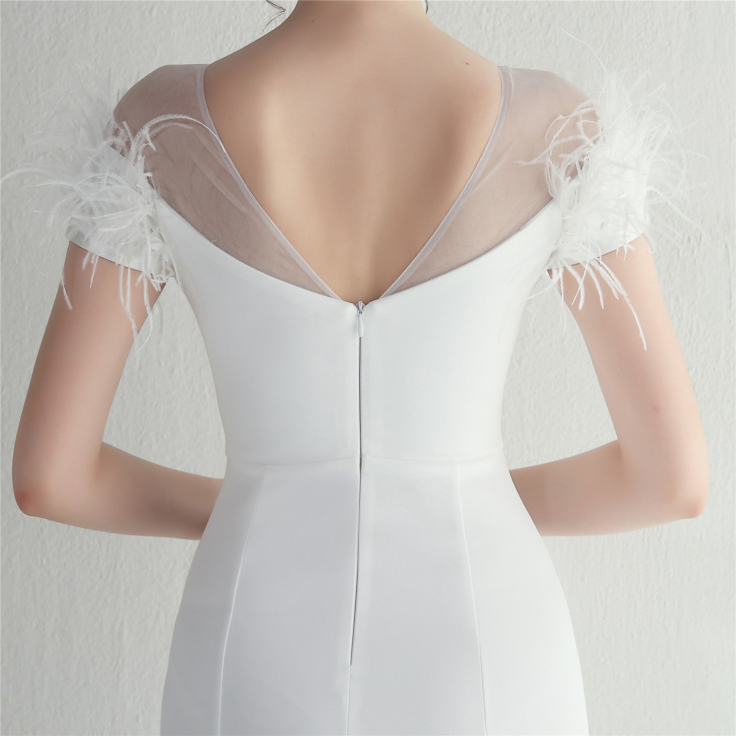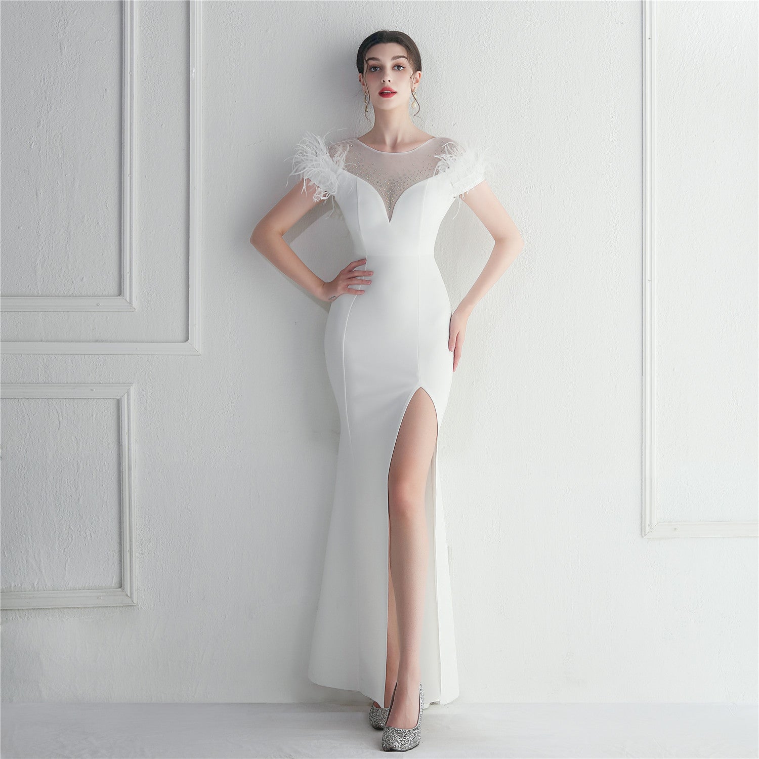 Step into sophistication with our elegant white evening gown. Featuring a form-fitting silhouette and a high slit, this dress exudes timeless elegance. The sheer illusion neckline with sparkling embellishments and feathered shoulder accents adds a touch of glamour. Crafted from smooth, structured fabric, it enhances your figure for a stunning impression at formal events, weddings, and red-carpet occasions.