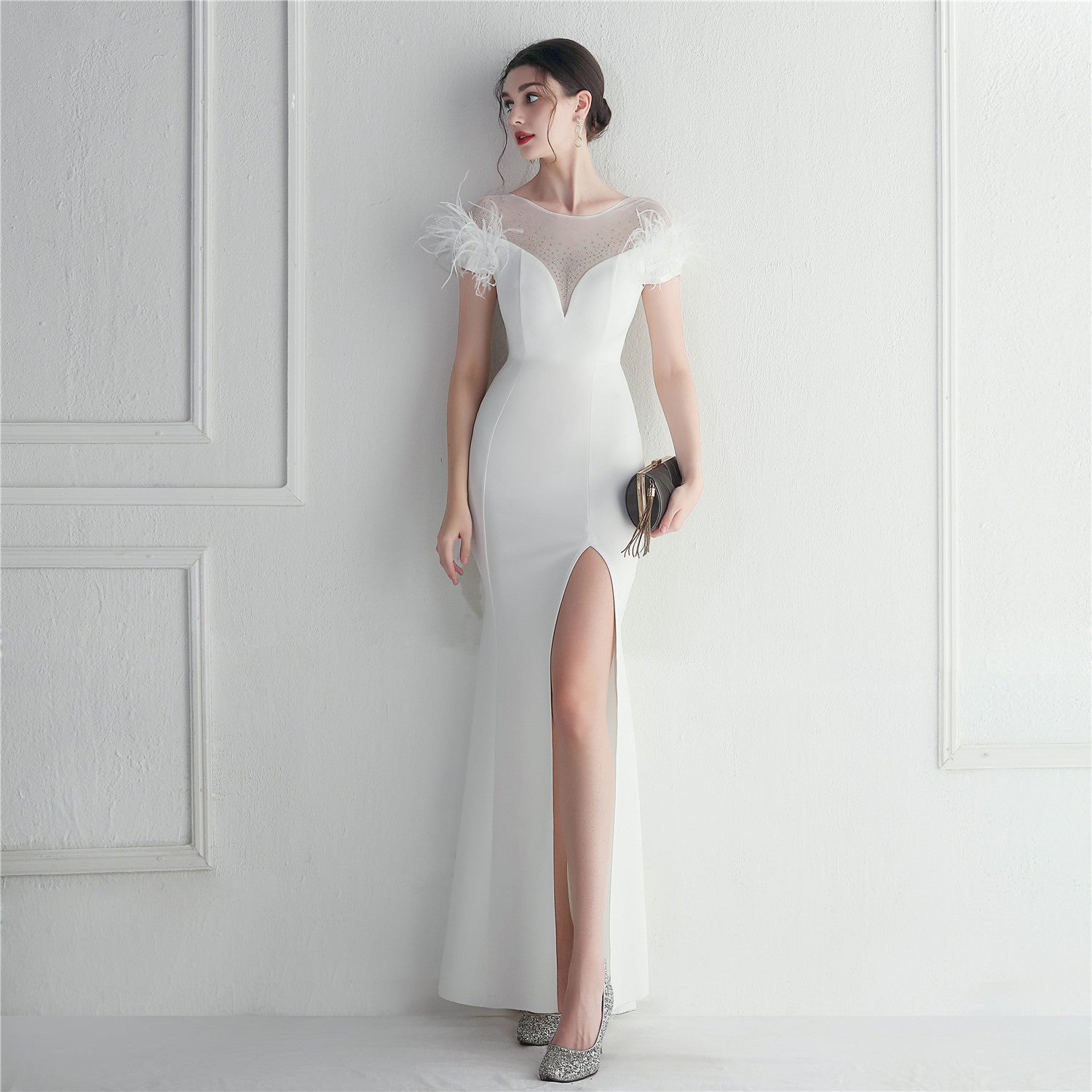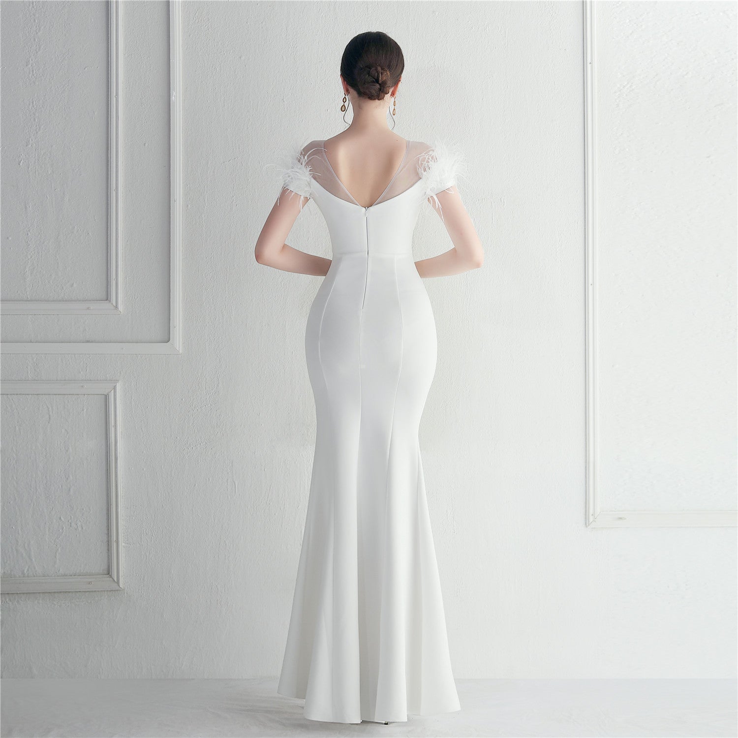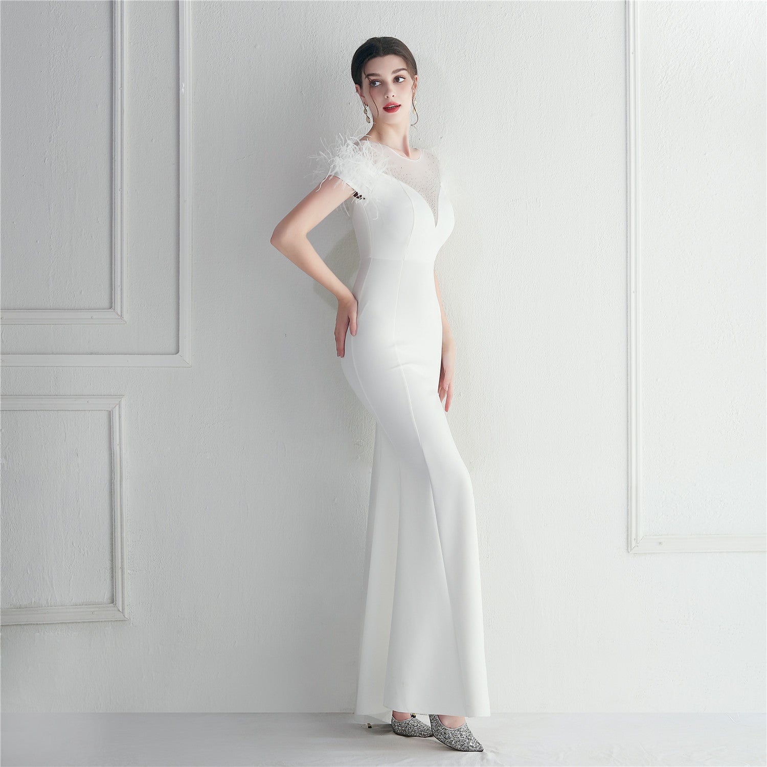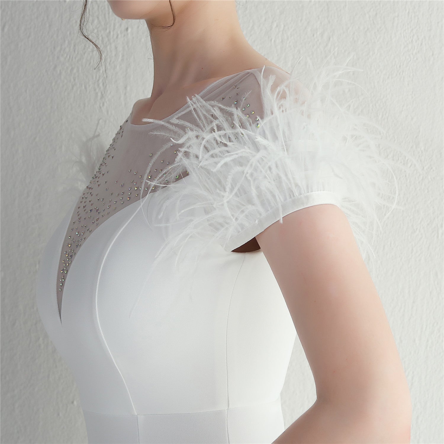 Step into sophistication with our elegant white evening gown. Featuring a form-fitting silhouette and a high slit, this dress exudes timeless elegance. The sheer illusion neckline with sparkling embellishments and feathered shoulder accents adds a touch of glamour. Crafted from smooth, structured fabric, it enhances your figure for a stunning impression at formal events, weddings, and red-carpet occasions.