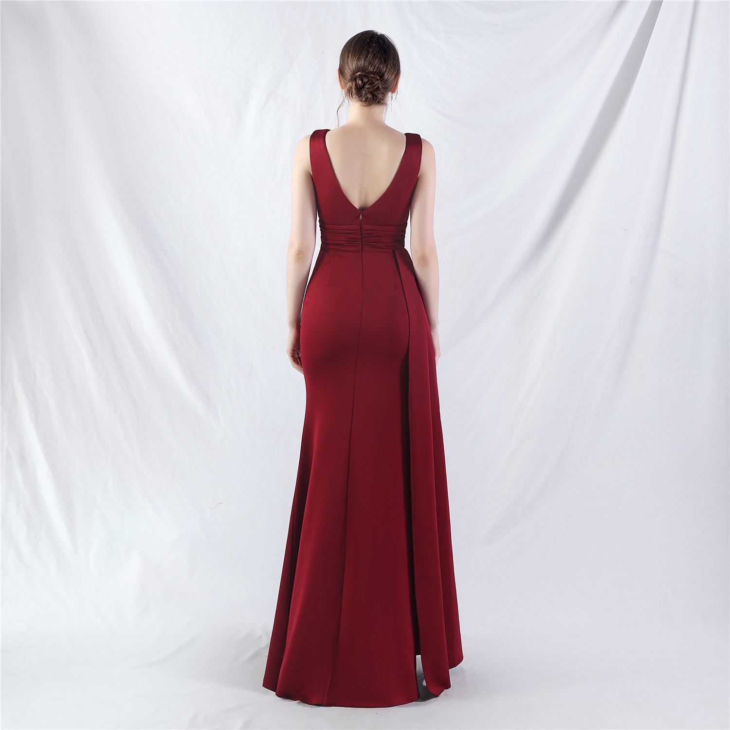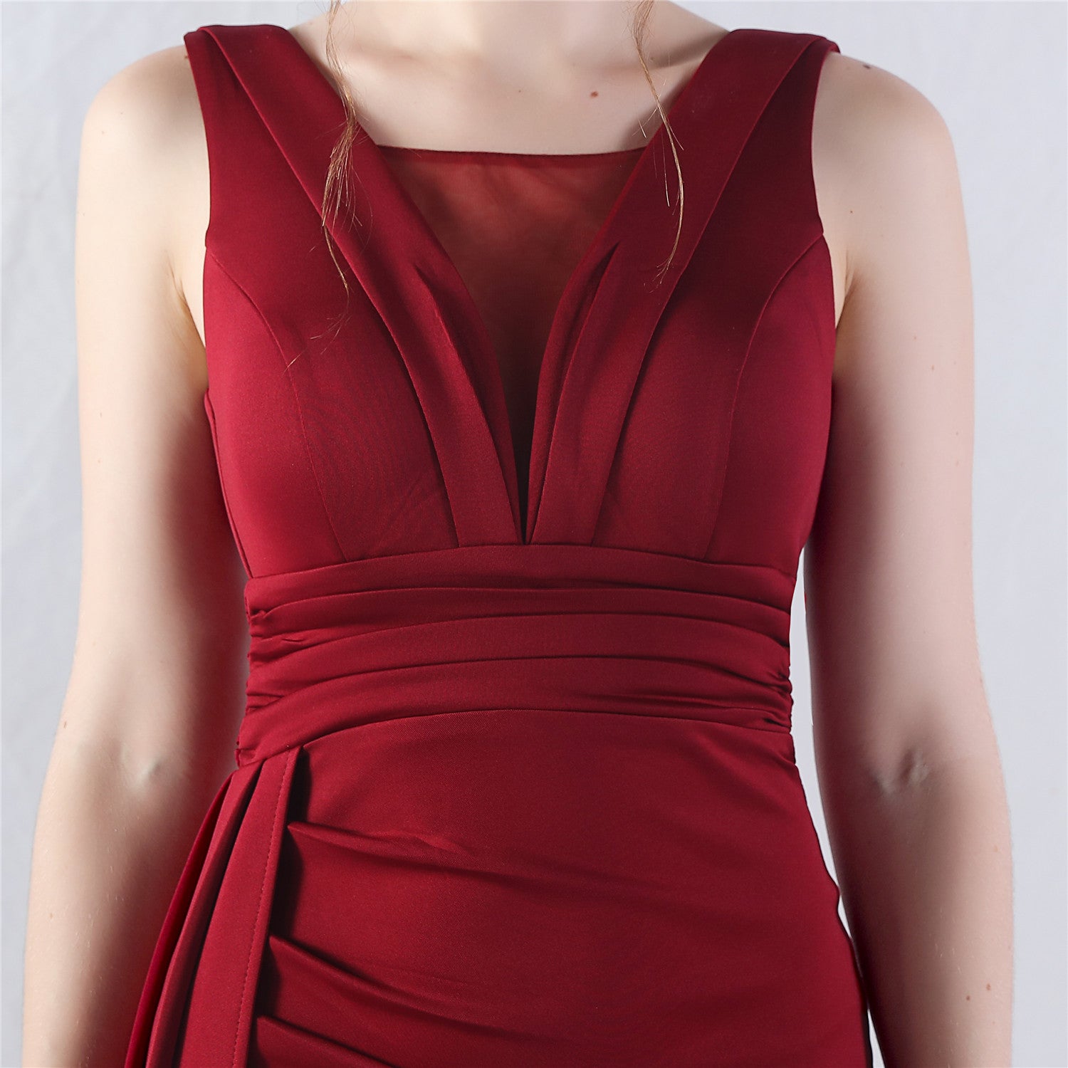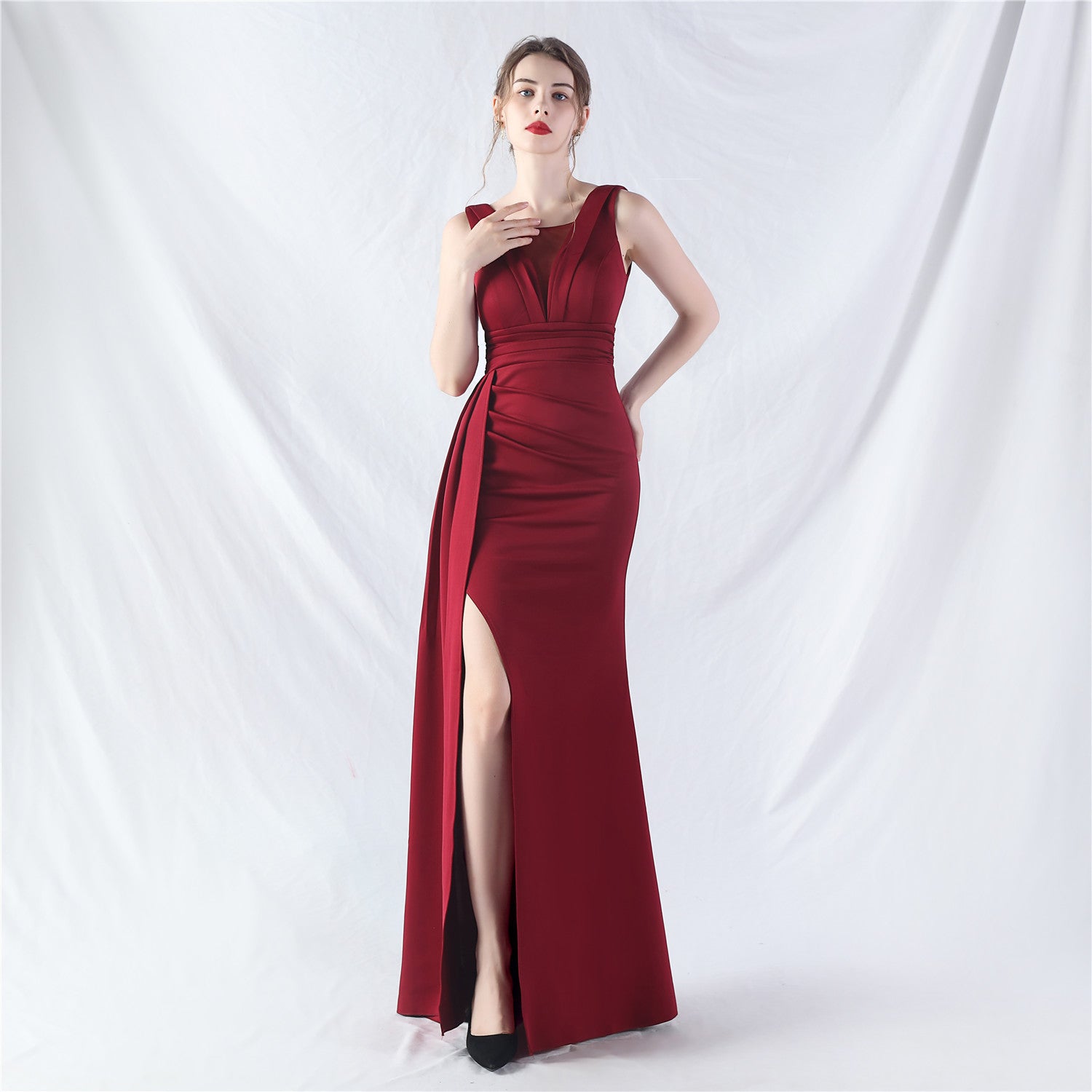 The Lunaria/Burgundy gown is a statement piece that embodies boldness and elegance. Its deep crimson shade and form-fitting silhouette, complete with a daring thigh-high slit, exude modern sophistication. The deep V-neckline and ruched waist add a touch of allure, while the subtle train makes it perfect for any special occasion.