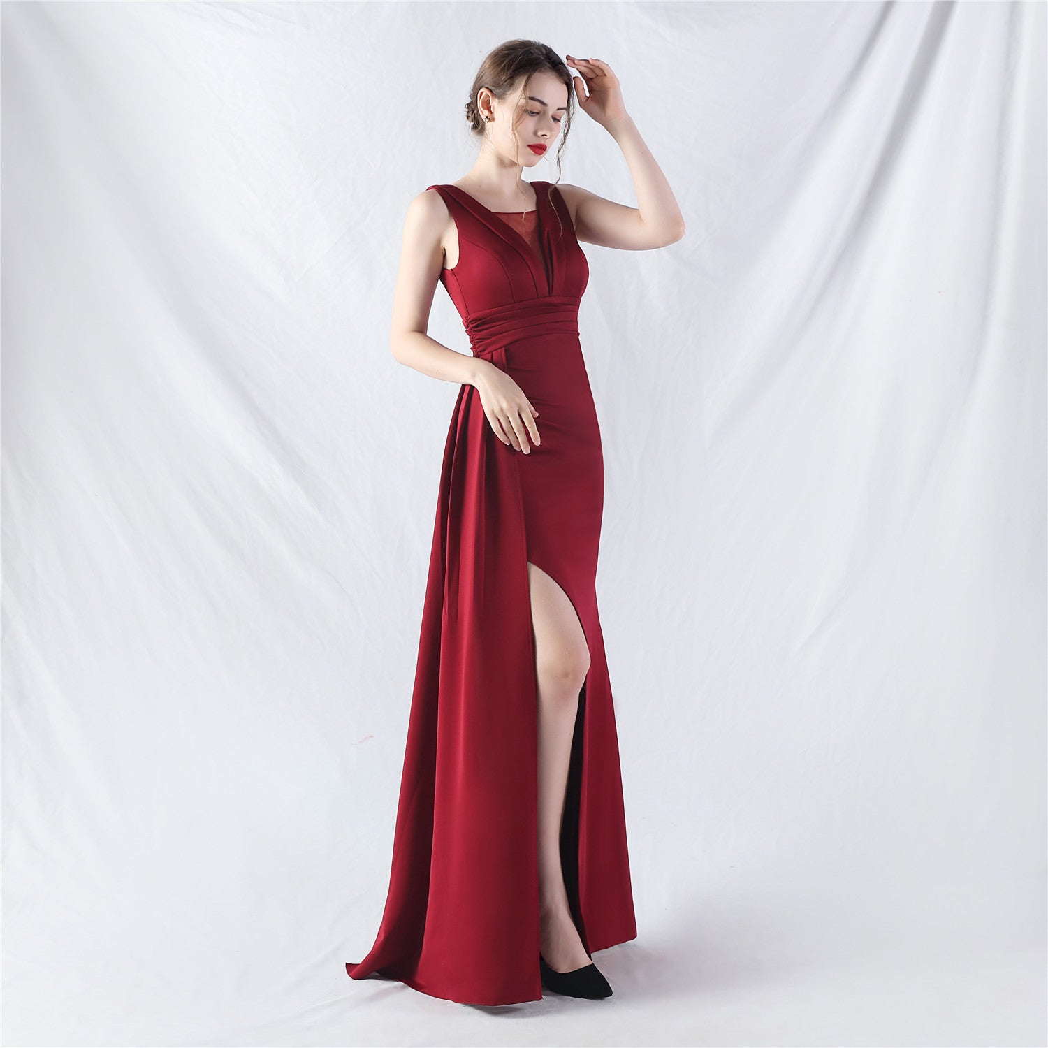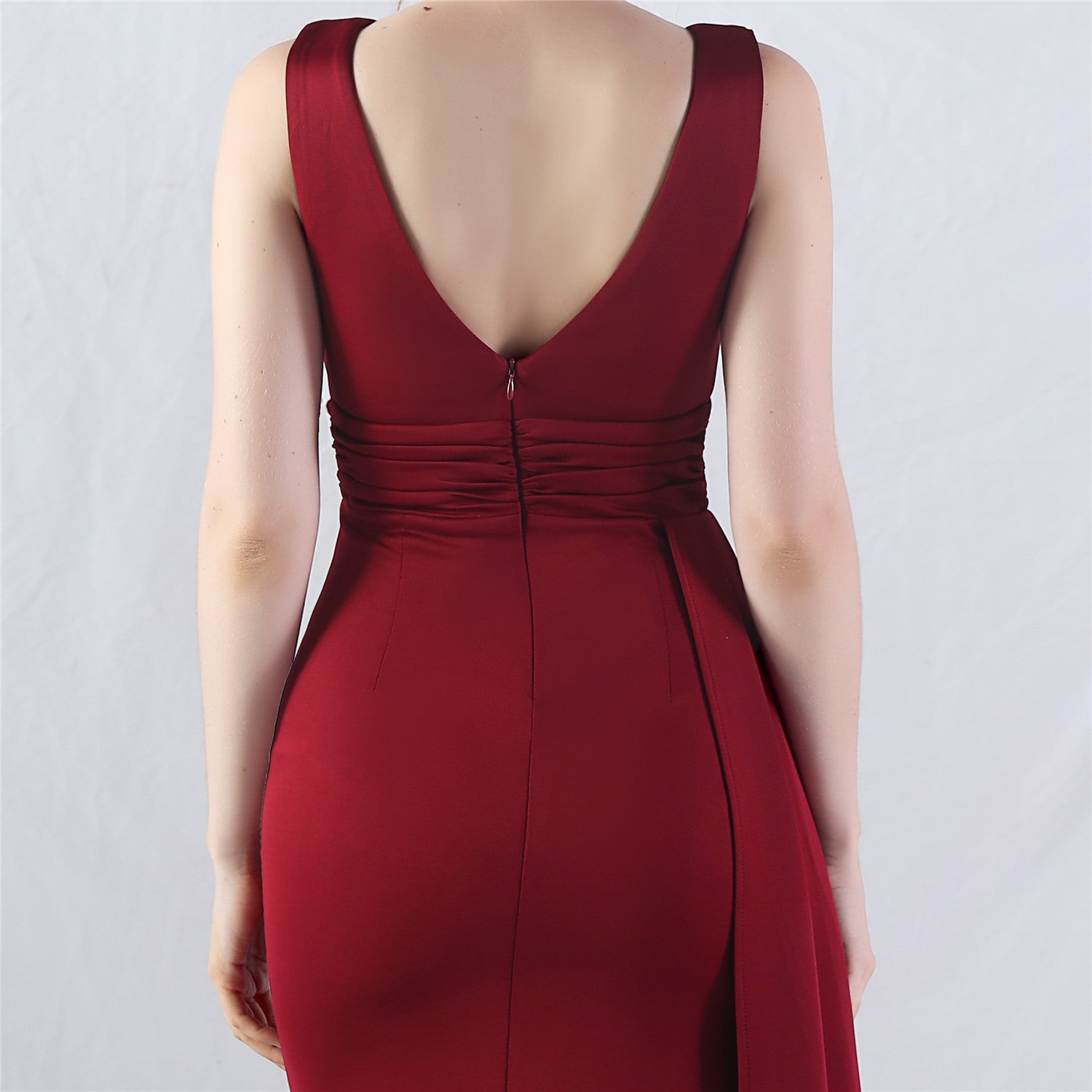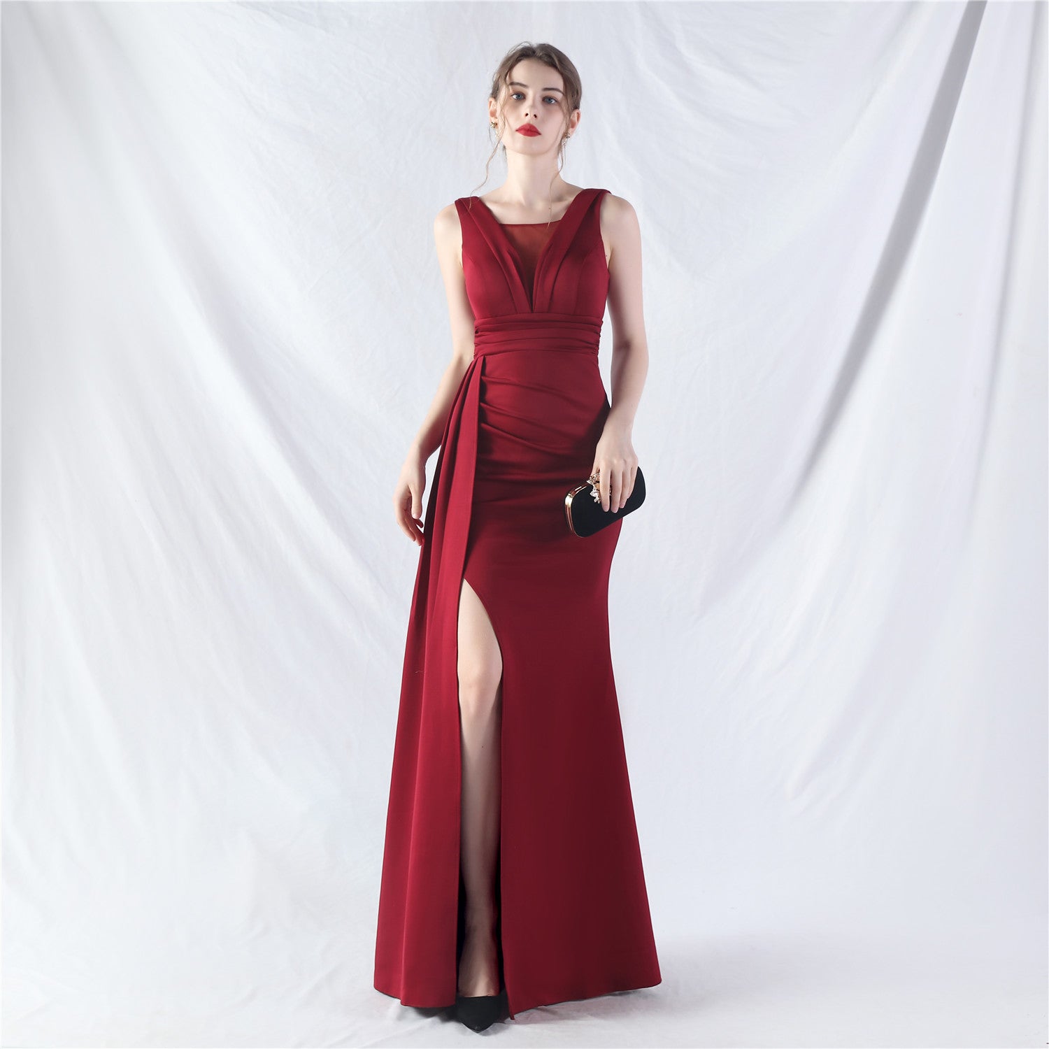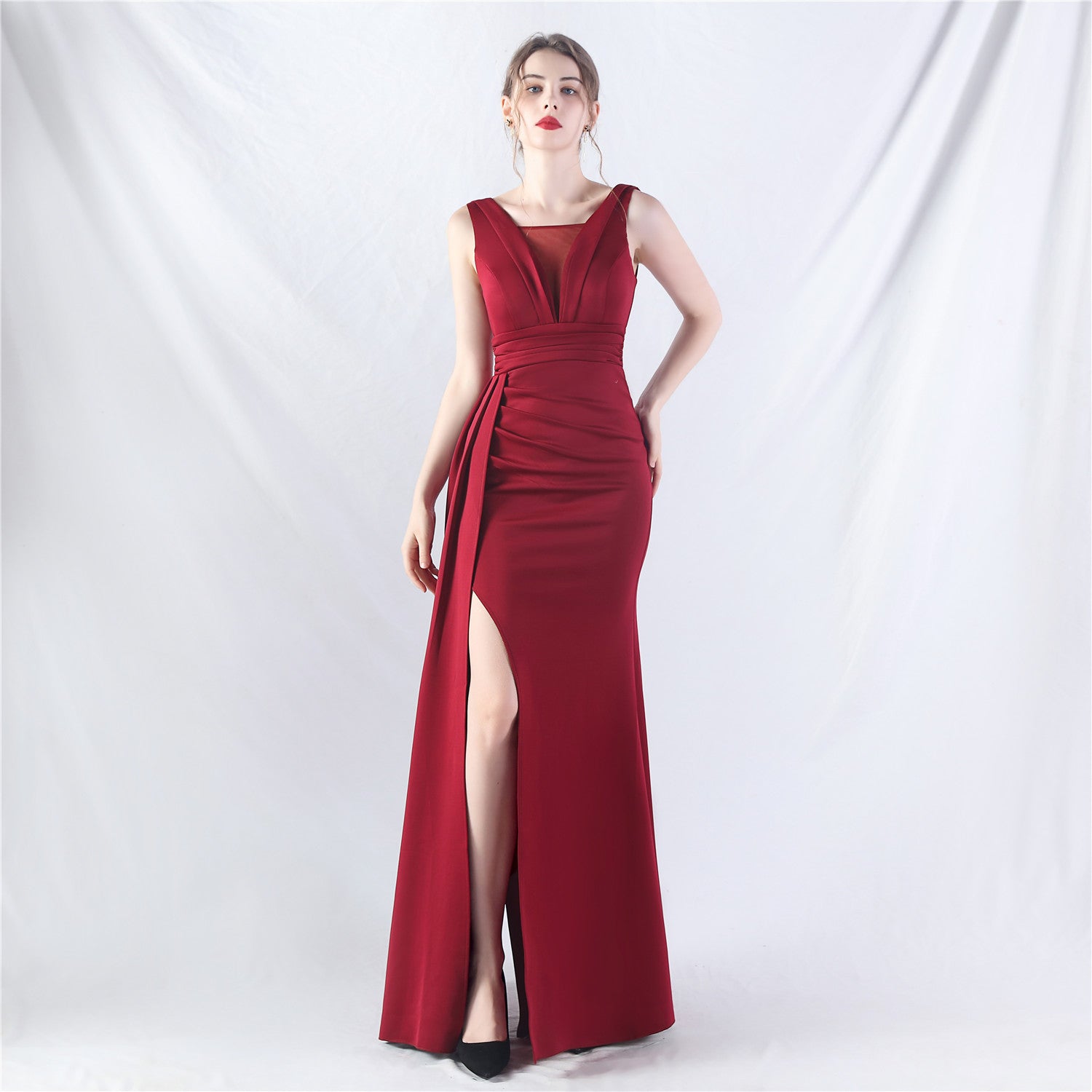 The Lunaria/Burgundy gown is a statement piece that embodies boldness and elegance. Its deep crimson shade and form-fitting silhouette, complete with a daring thigh-high slit, exude modern sophistication. The deep V-neckline and ruched waist add a touch of allure, while the subtle train makes it perfect for any special occasion.