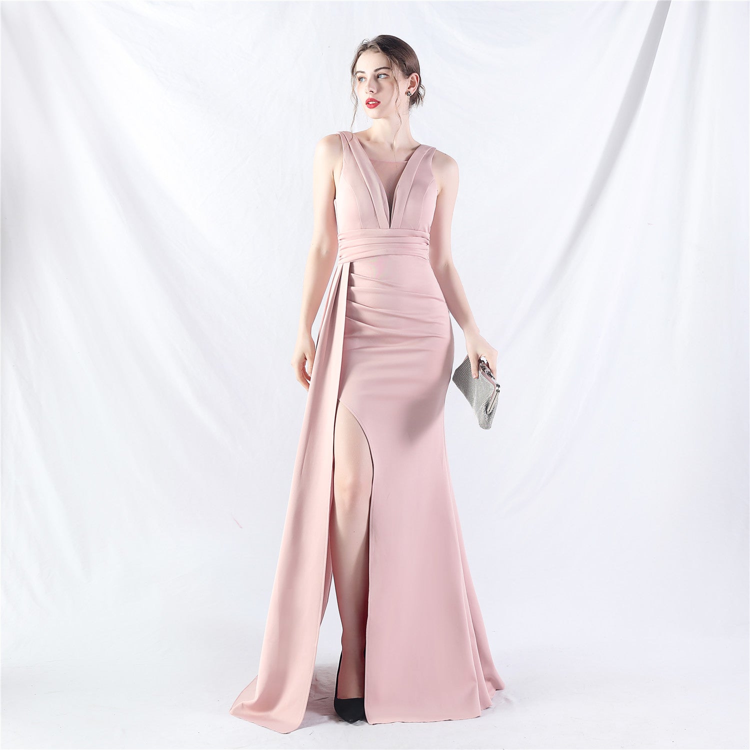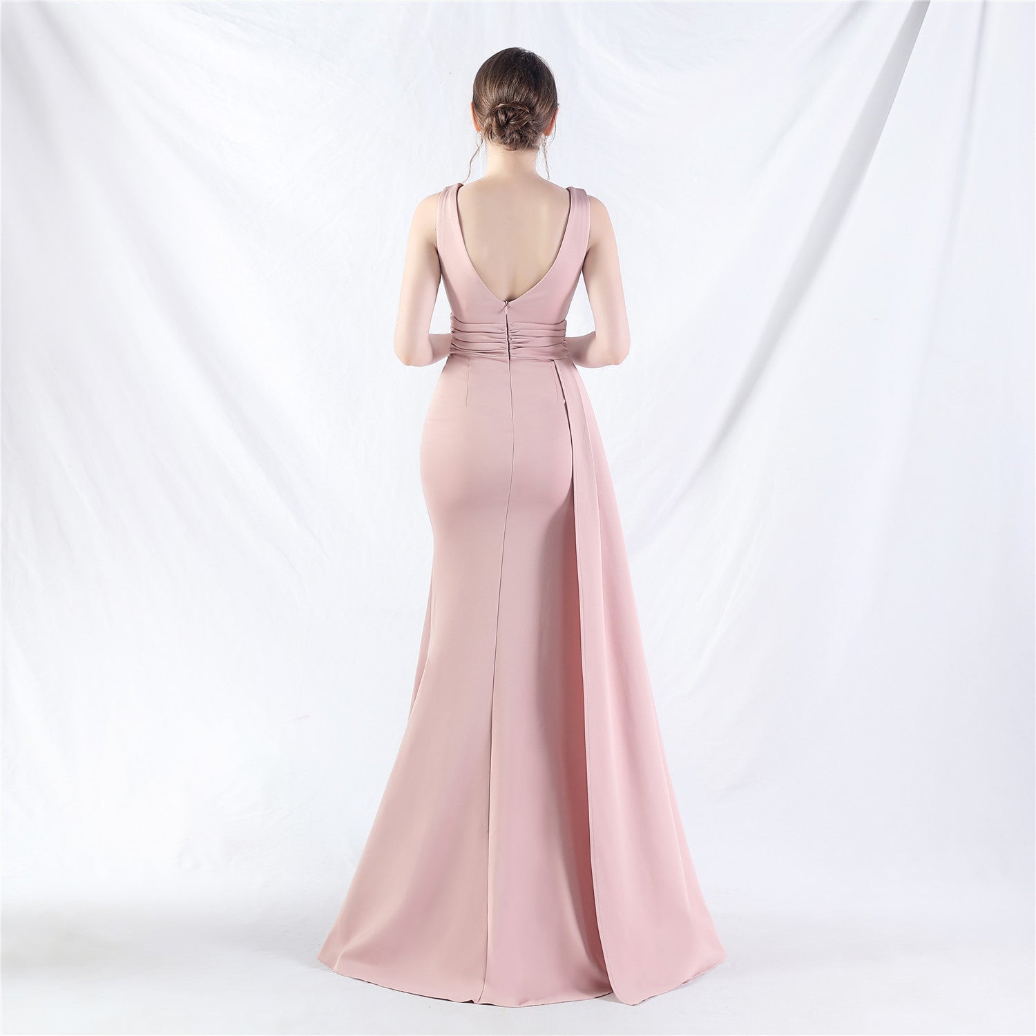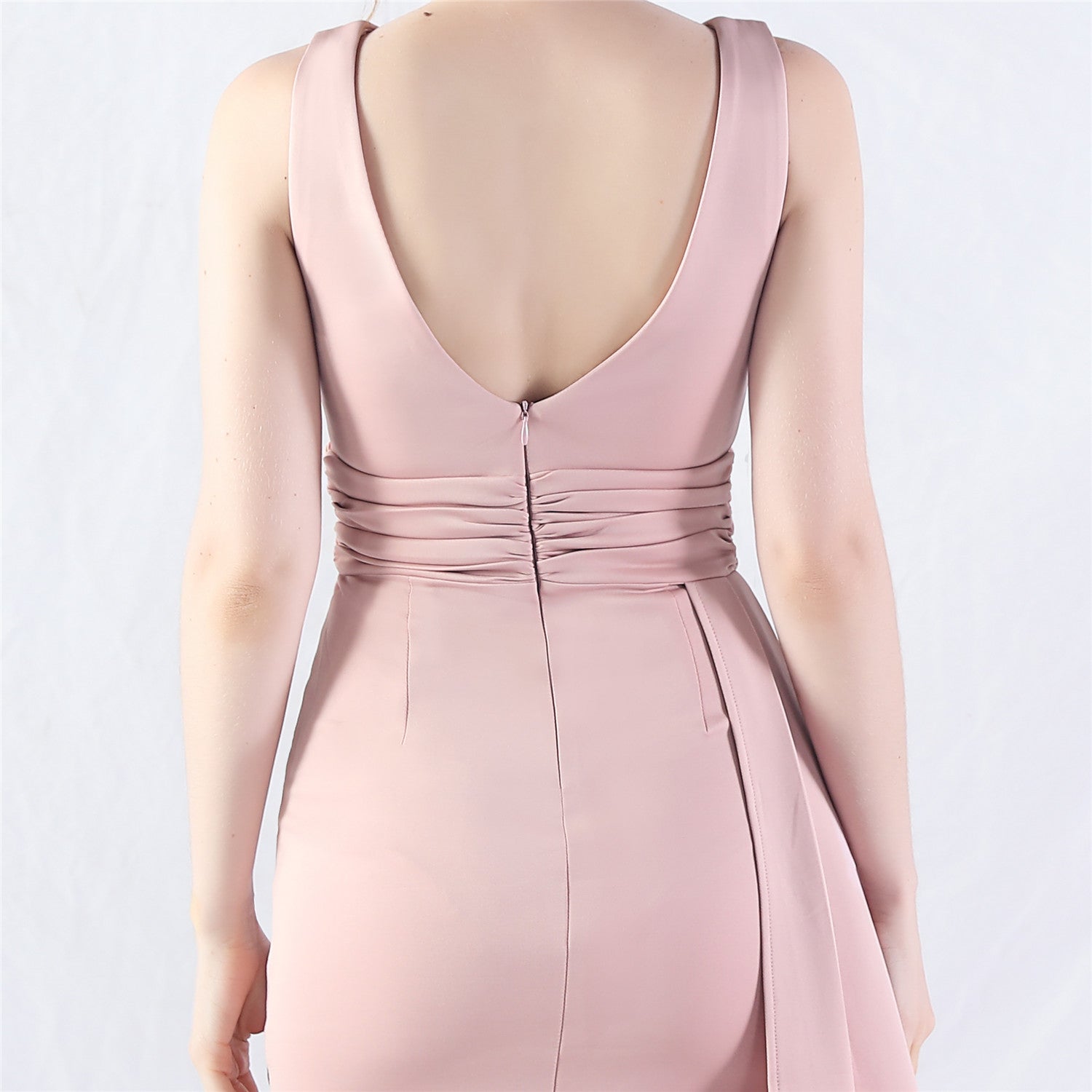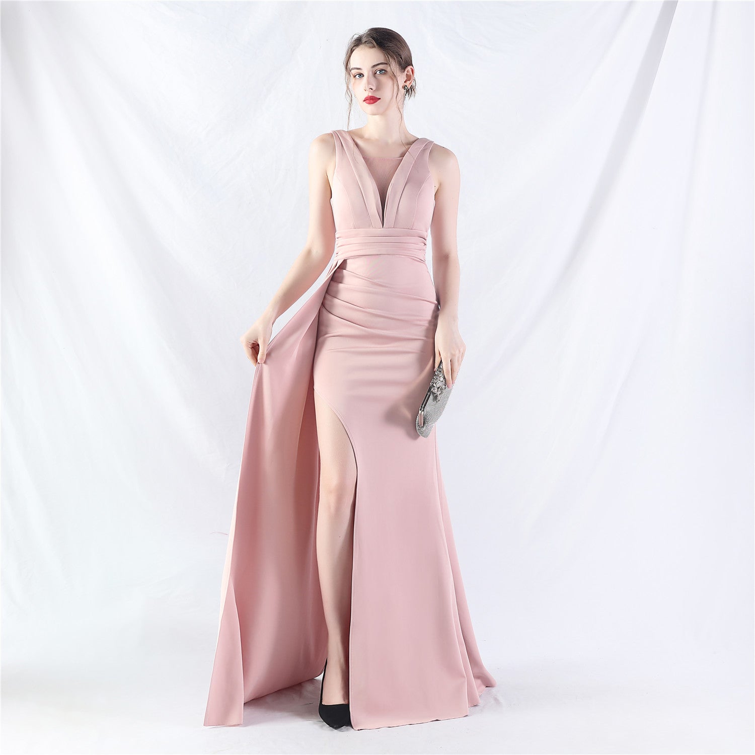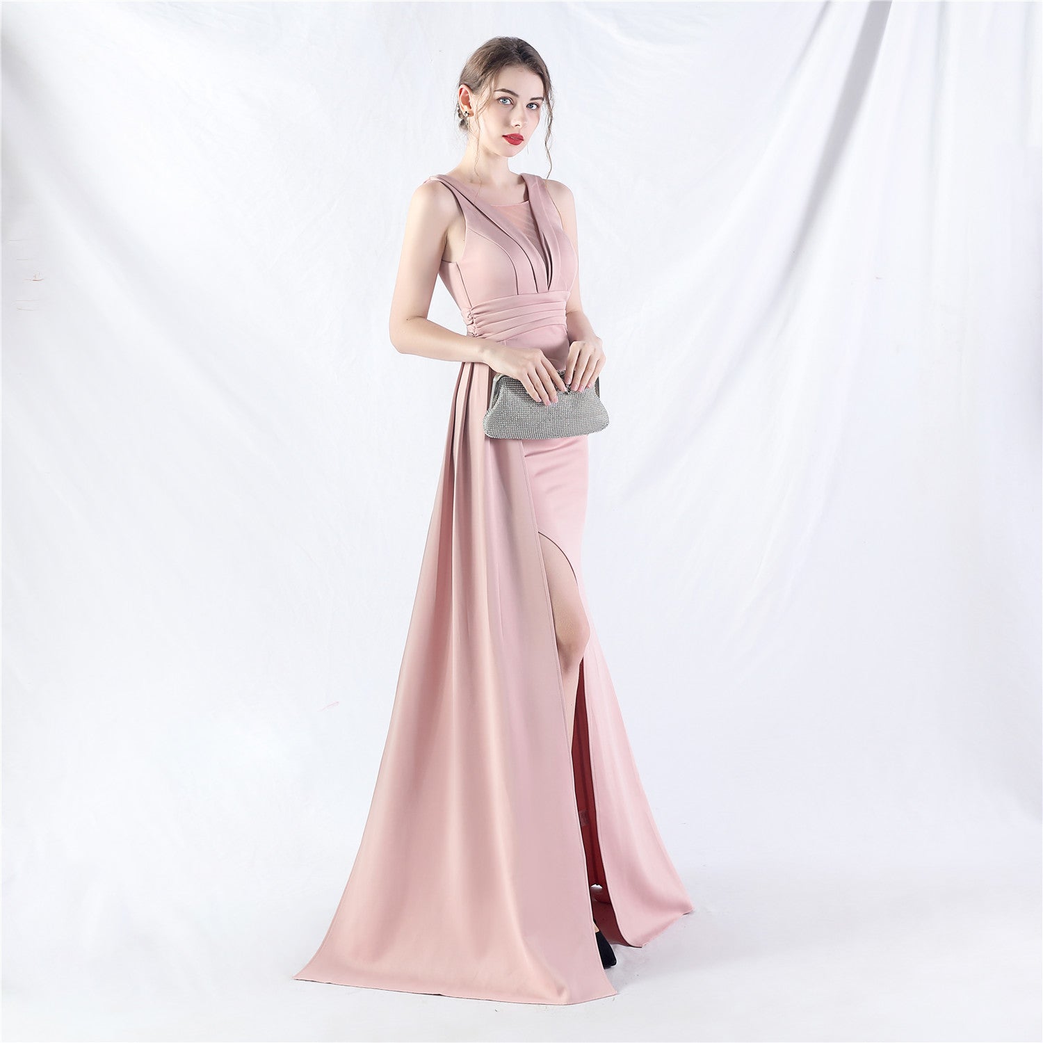Elevate your formal attire with the Lunaria in Pink, a meticulously designed evening gown that combines sophistication with sensuality. The premium stretch fabric ensures comfort while the sleeveless, floor-length silhouette with deep V-neckline flatters your natural curves. Strategic ruching at the waist creates an hourglass effect, complemented by an elegant side drape and thigh-high slit for dramatic movement. This versatile statement piece transitions effortlessly between weddings, galas, and upscale events, requiring only minimal accessories to complete its refined aesthetic.