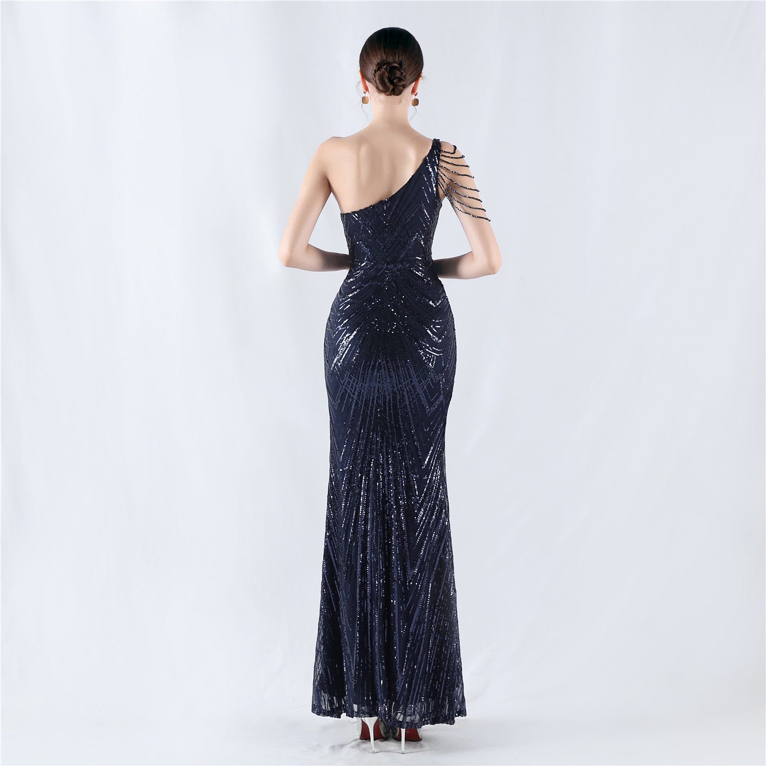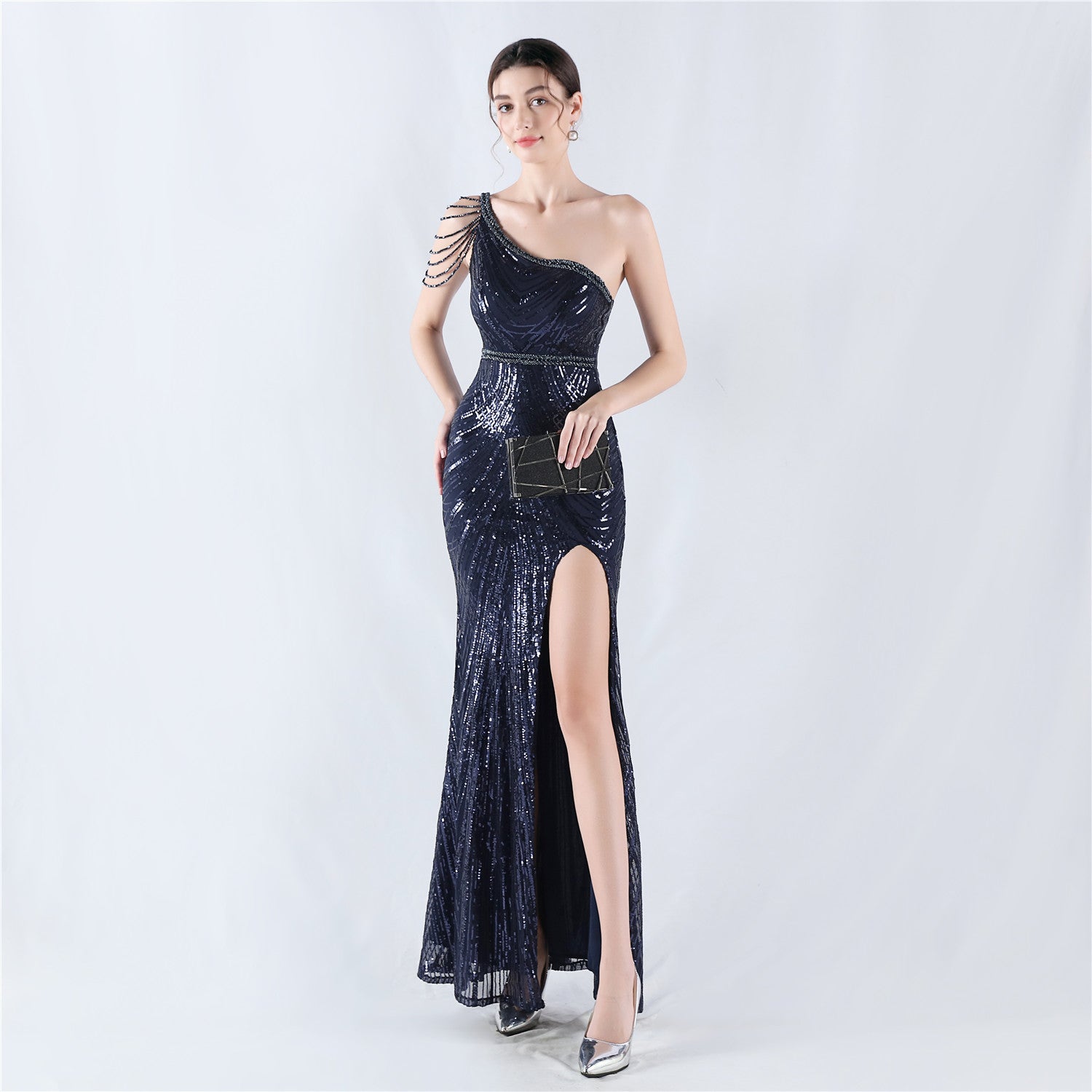 Get ready to make a statement with our "Midnight" gown. Designed for all body types, this dazzling navy sequin dress celebrates and empowers. Featuring a one-shoulder silhouette and delicate beadwork, it offers both elegance and comfort. Tailored for super-size figures, it accentuates curves for a luxurious and dynamic look.