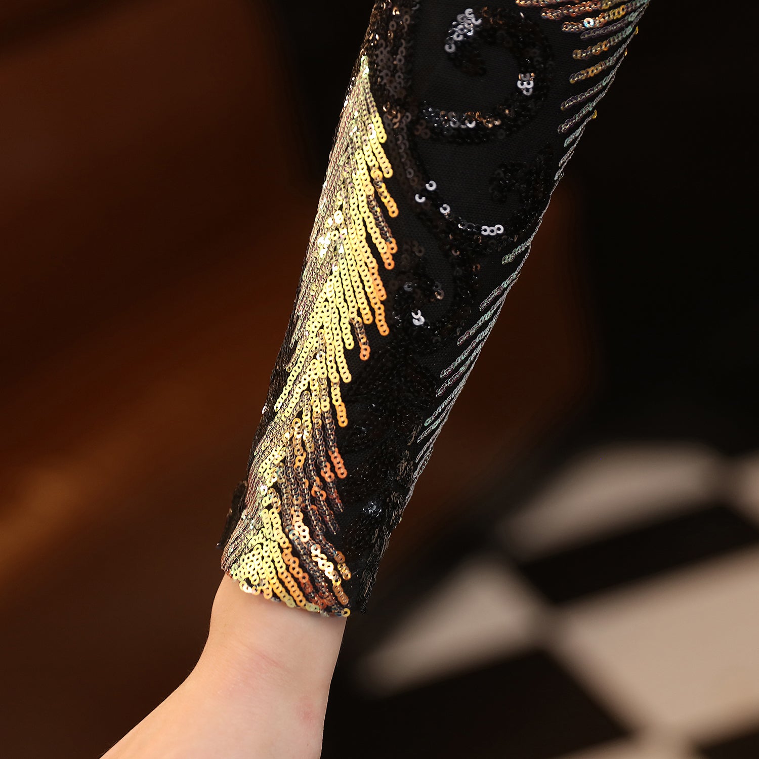 The Olivienne gown in black exudes refined elegance with its full-length silhouette and expertly crafted sequin embroidery. Its sheer mesh base showcases intricate, shimmering patterns that catch the light beautifully. Featuring long sleeves and a classic round neckline, this dress offers a contoured fit that enhances your natural curves. Ideal for black-tie events and formal occasions, the Olivienne combines sophisticated design with striking detail to ensure a memorable, polished appearance.