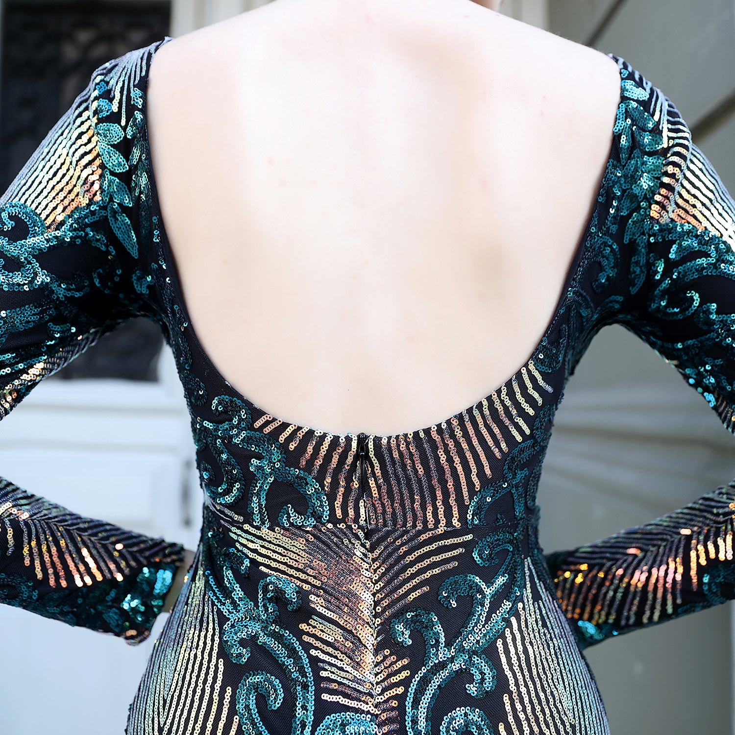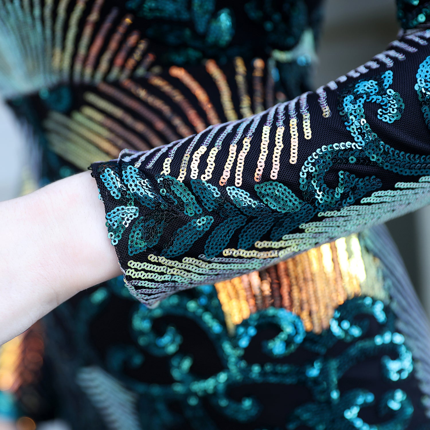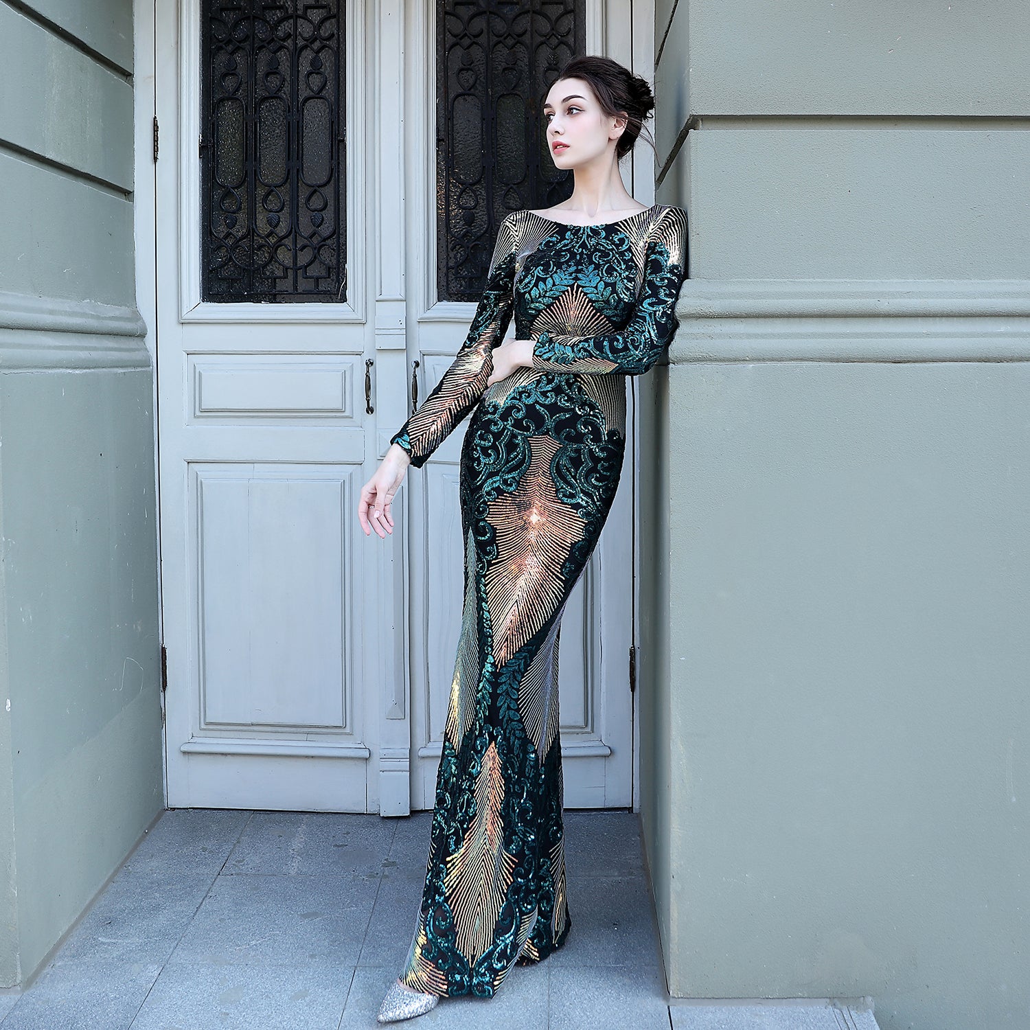 The Olivienne gown in green exudes refined elegance with its full-length silhouette and expertly crafted sequin embroidery. Its sheer mesh base showcases intricate, shimmering patterns that catch the light beautifully. Featuring long sleeves and a classic round neckline, this dress offers a contoured fit that enhances your natural curves. Ideal for black-tie events and formal occasions, the Olivienne combines sophisticated design with striking detail to ensure a memorable, polished appearance.