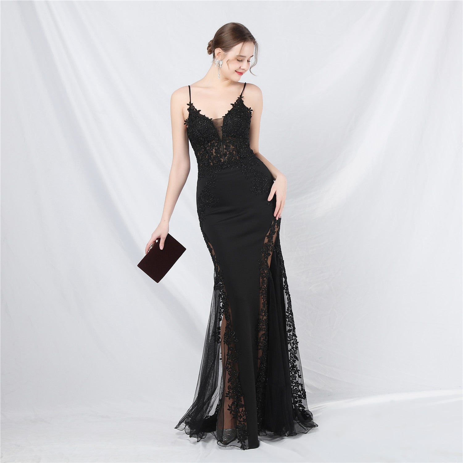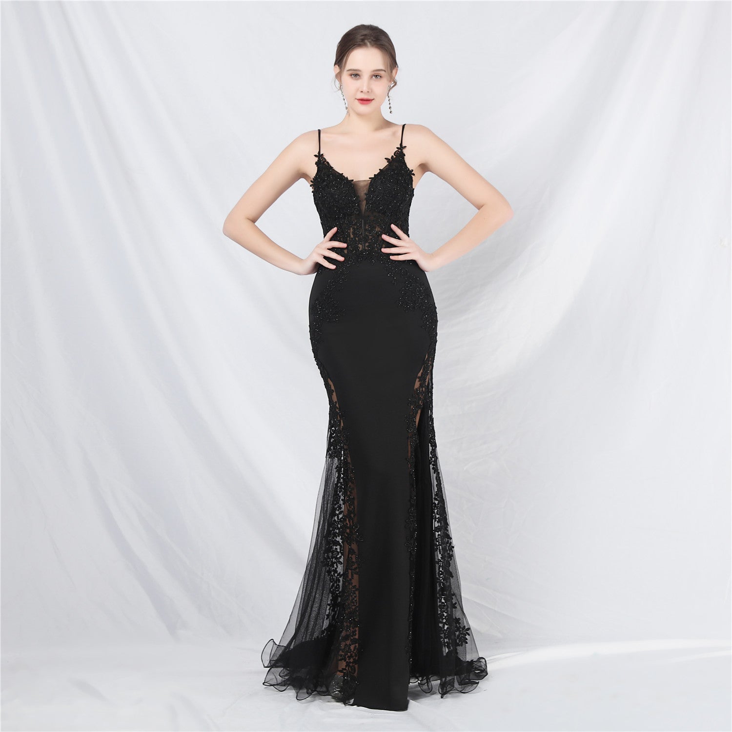 Introducing the Royal Bloom/Black evening gown. This stunning dress features a fitted bodice with delicate lace and beadwork, thin spaghetti straps, and a plunging neckline. The sheer lace inserts and soft tulle in the floor-length skirt create a graceful and dramatic effect. Perfect for formal events, this gown exudes timeless glamour.