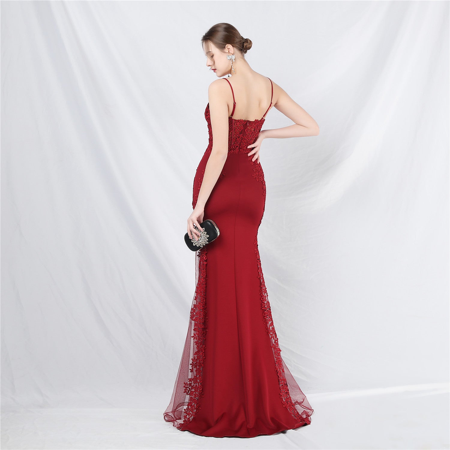Experience unforgettable sophistication in the Royal Bloom/Burgundy gown. Delicate spaghetti straps and a plunging neckline accentuate the romantic and sensual silhouette, while intricate lace appliqué and semi-sheer paneling add elegance. The fitted waist and flowing mesh skirt gracefully enhance the feminine form. Perfect for gala events, evening occasions, or any moment that calls for captivating charm.