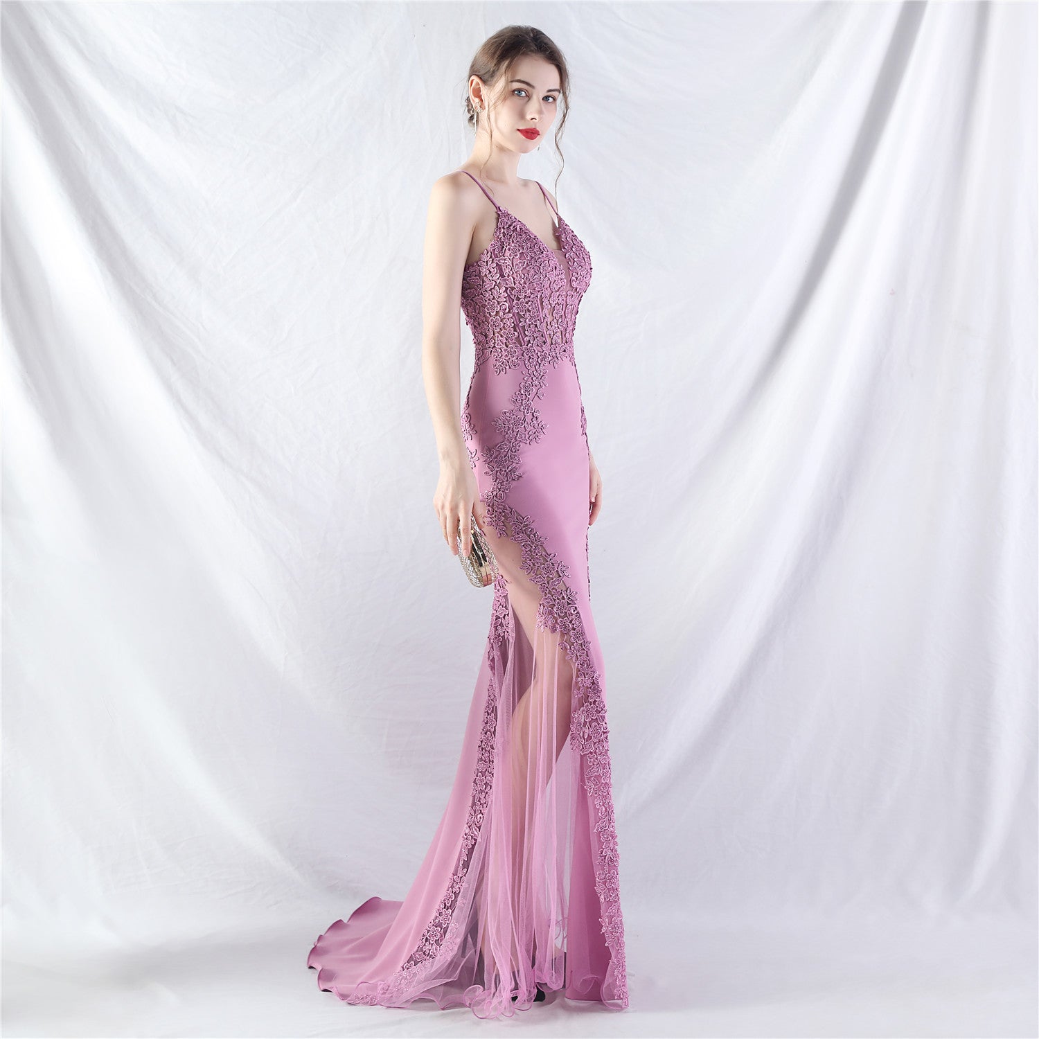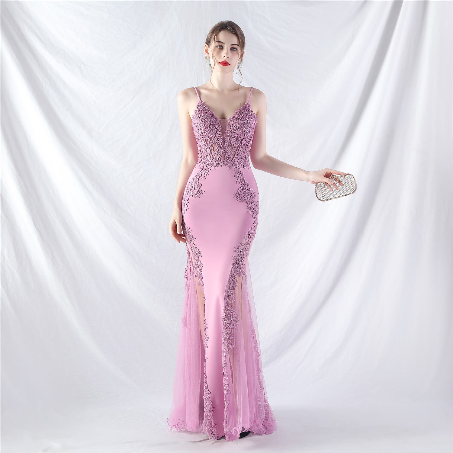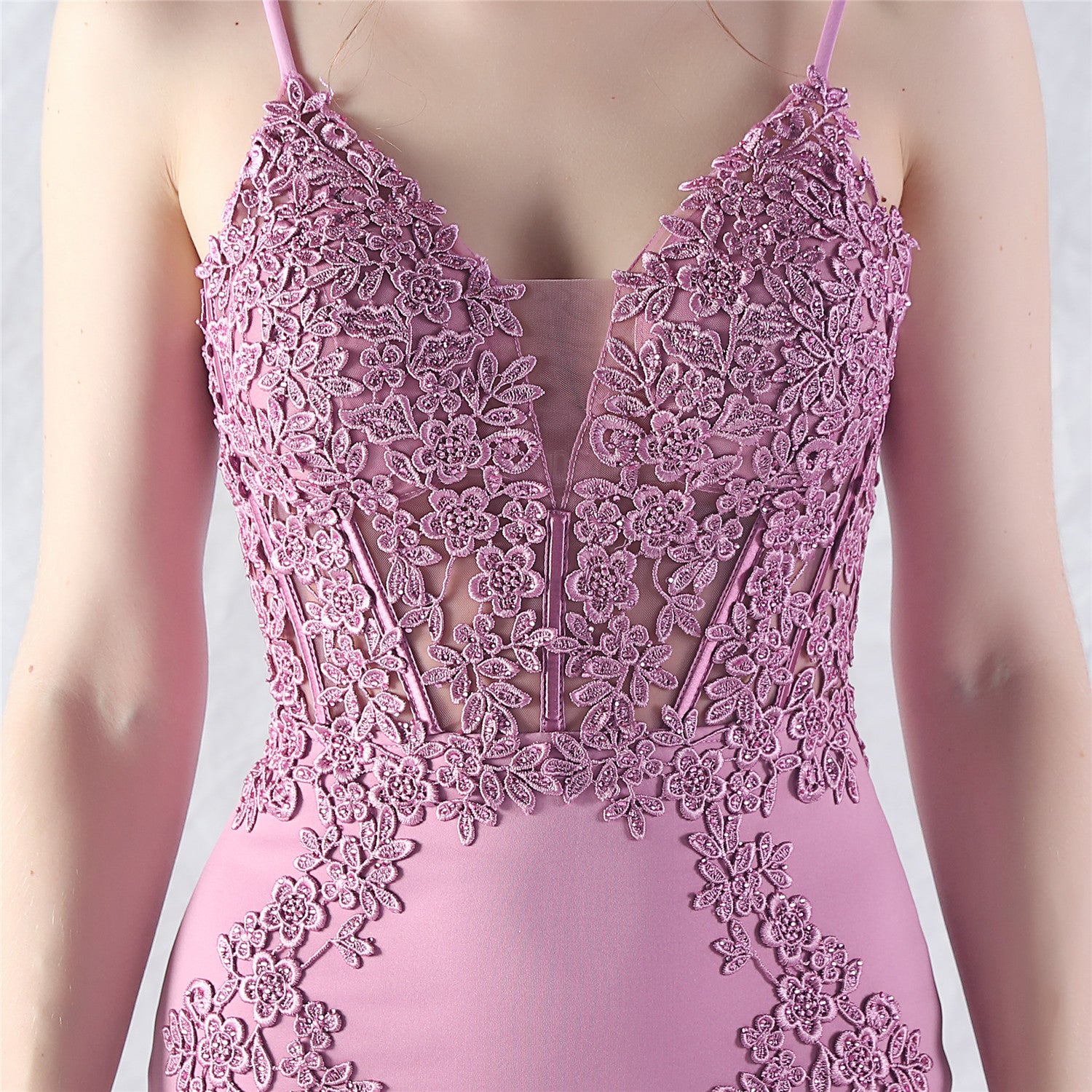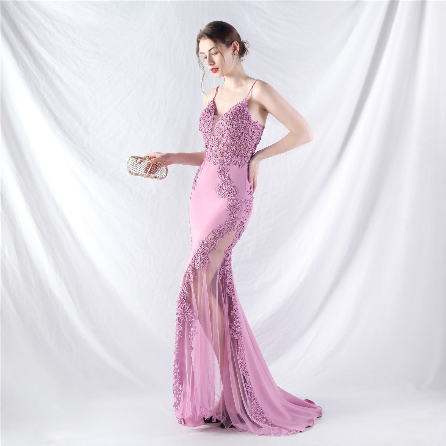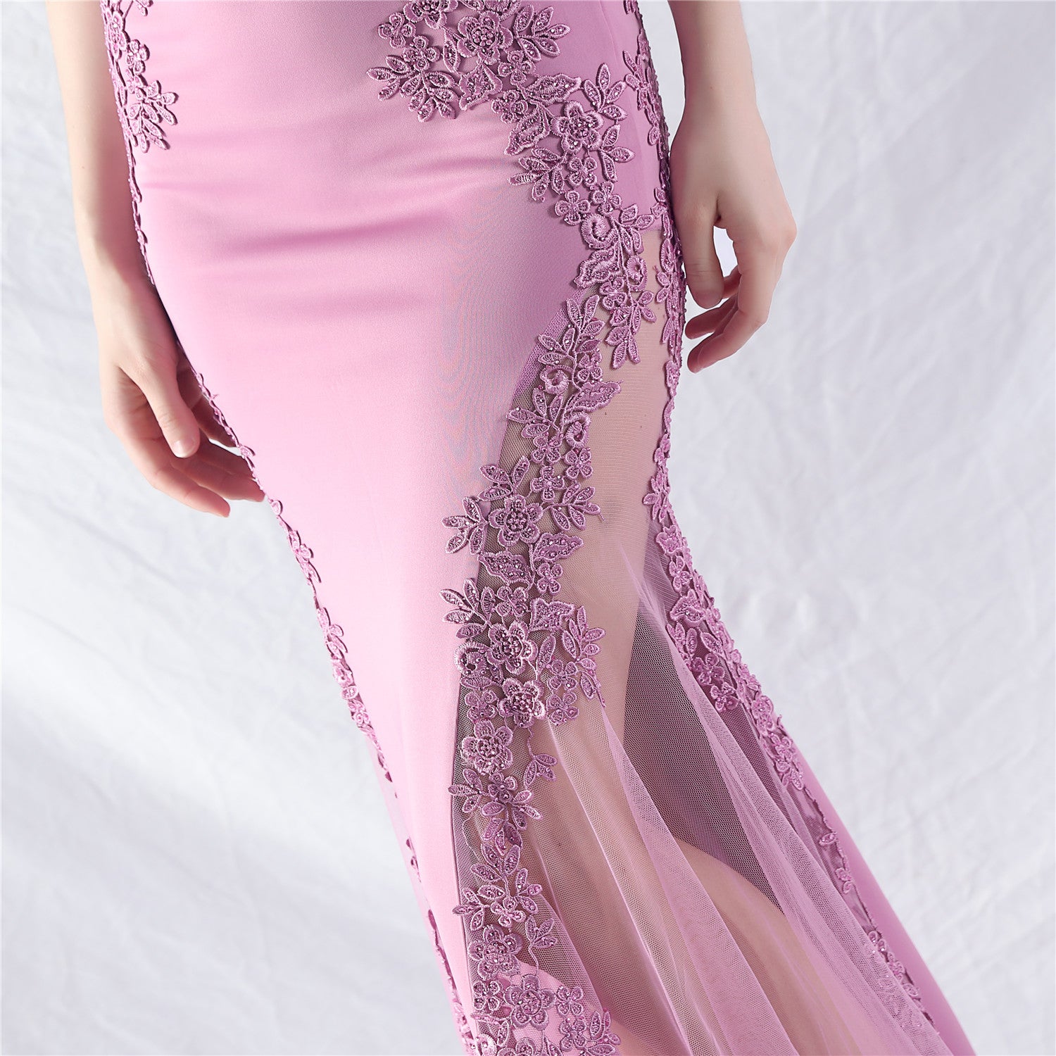Enhance any occasion with the enchanting Royal Bloom/Lavender. Featuring delicate floral lace embroidery, sheer tulle panels, and a plunging neckline, this orchid pink gown effortlessly balances romance and sophistication. Perfect for soirées, weddings, or red-carpet moments.