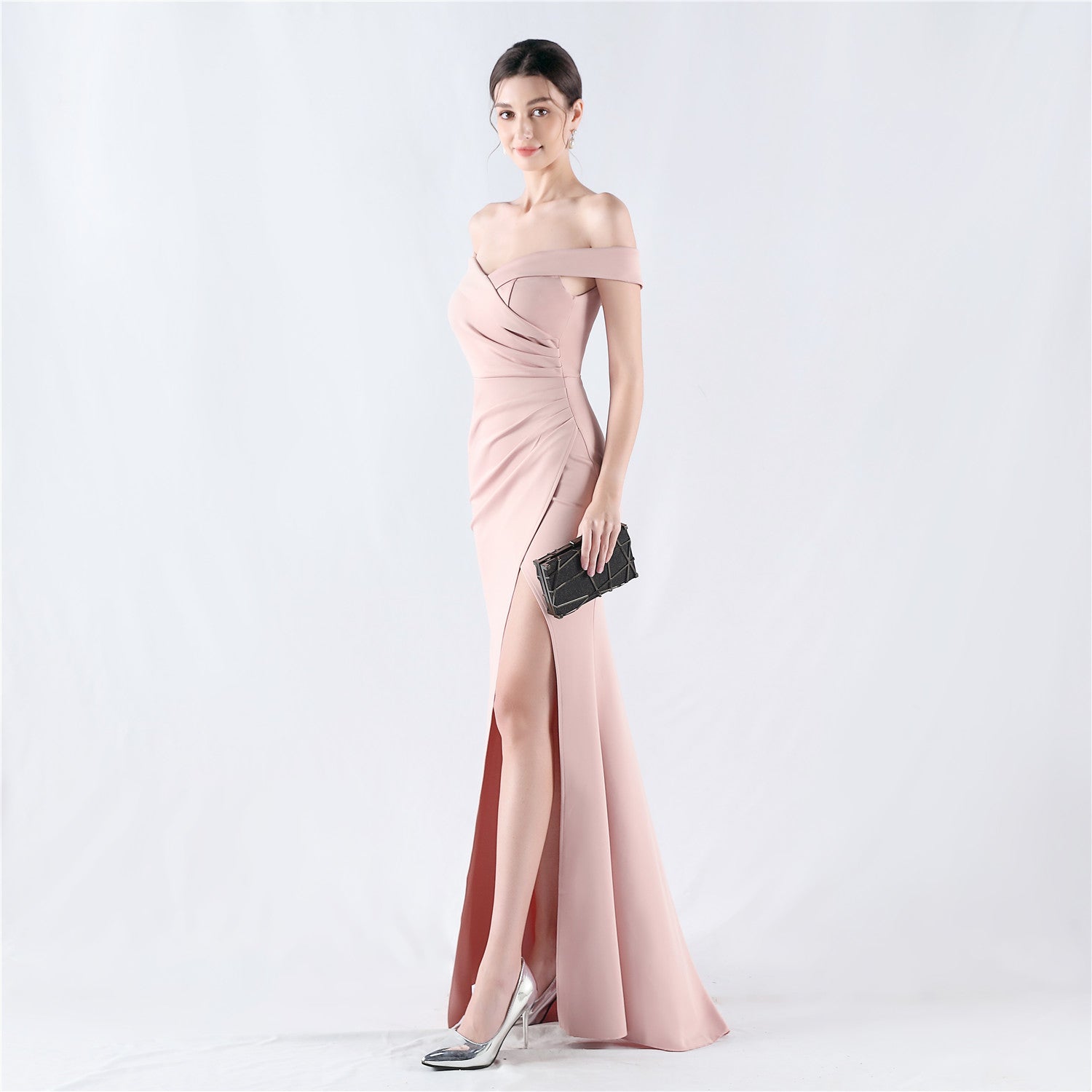 Indulge in elegance with our Scarlet/Pink off-the-shoulder mermaid gown. The beautiful blush pink colour and sophisticated silhouette will make a lasting impression at any formal event. With a form-fitting shape that accentuates curves and a chic crisscross design, this dress is both flattering and glamorous. Made with luxurious fabric, this gown flows effortlessly and features a high slit for ease of movement. Pair with metallic heels for a polished, head-turning look.