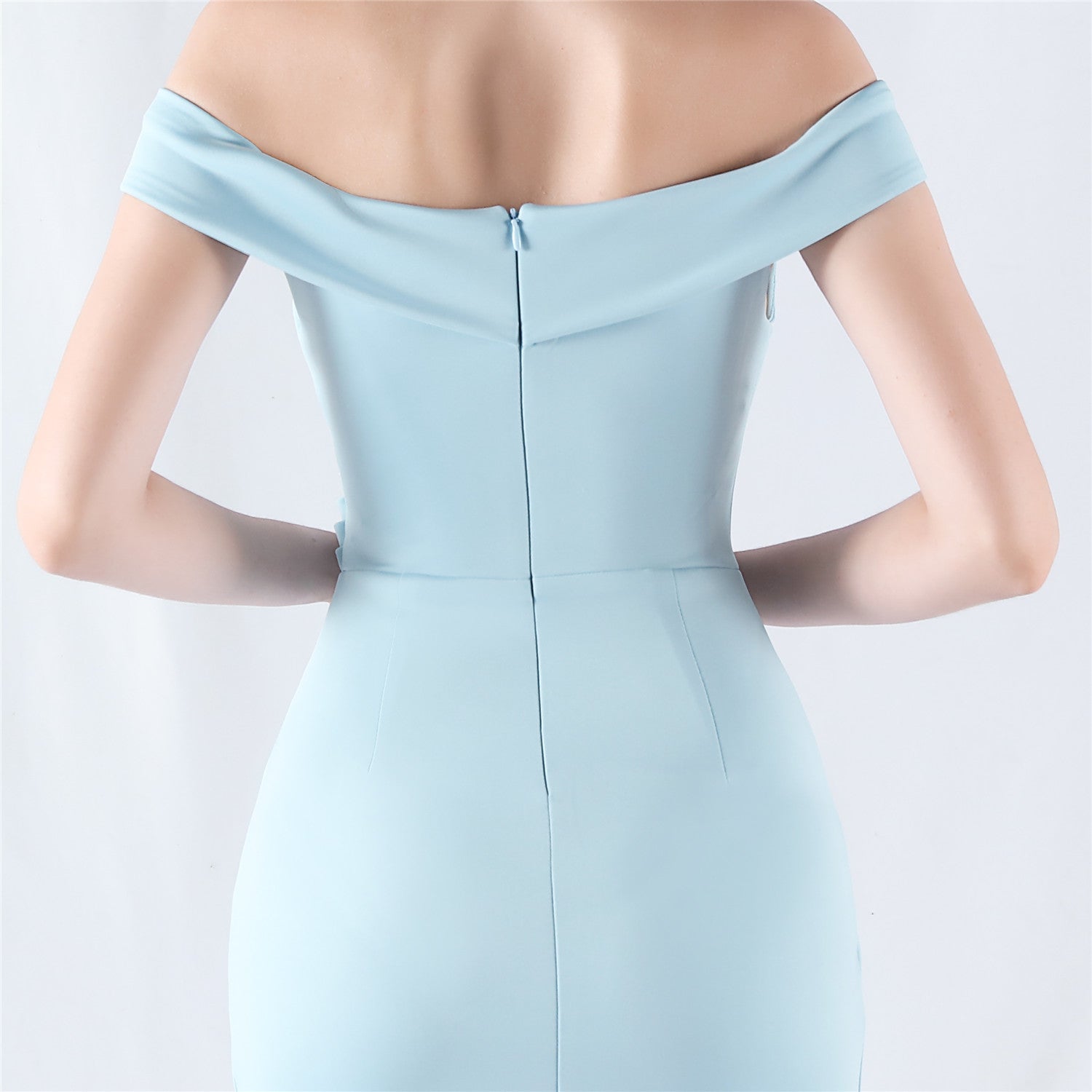 Indulge in sophistication with our Scarlet/Sky Blue off-shoulder evening gown. This luxurious dress features a fitted bodice with delicate ruching to enhance your curves and a floor-length skirt with a high slit for added allure. The pastel blue hue and off-shoulder neckline exude timeless elegance. Perfect for weddings, galas, and prom nights. Available in sizes XS-XL. Elevate your style with this stunning gown.
