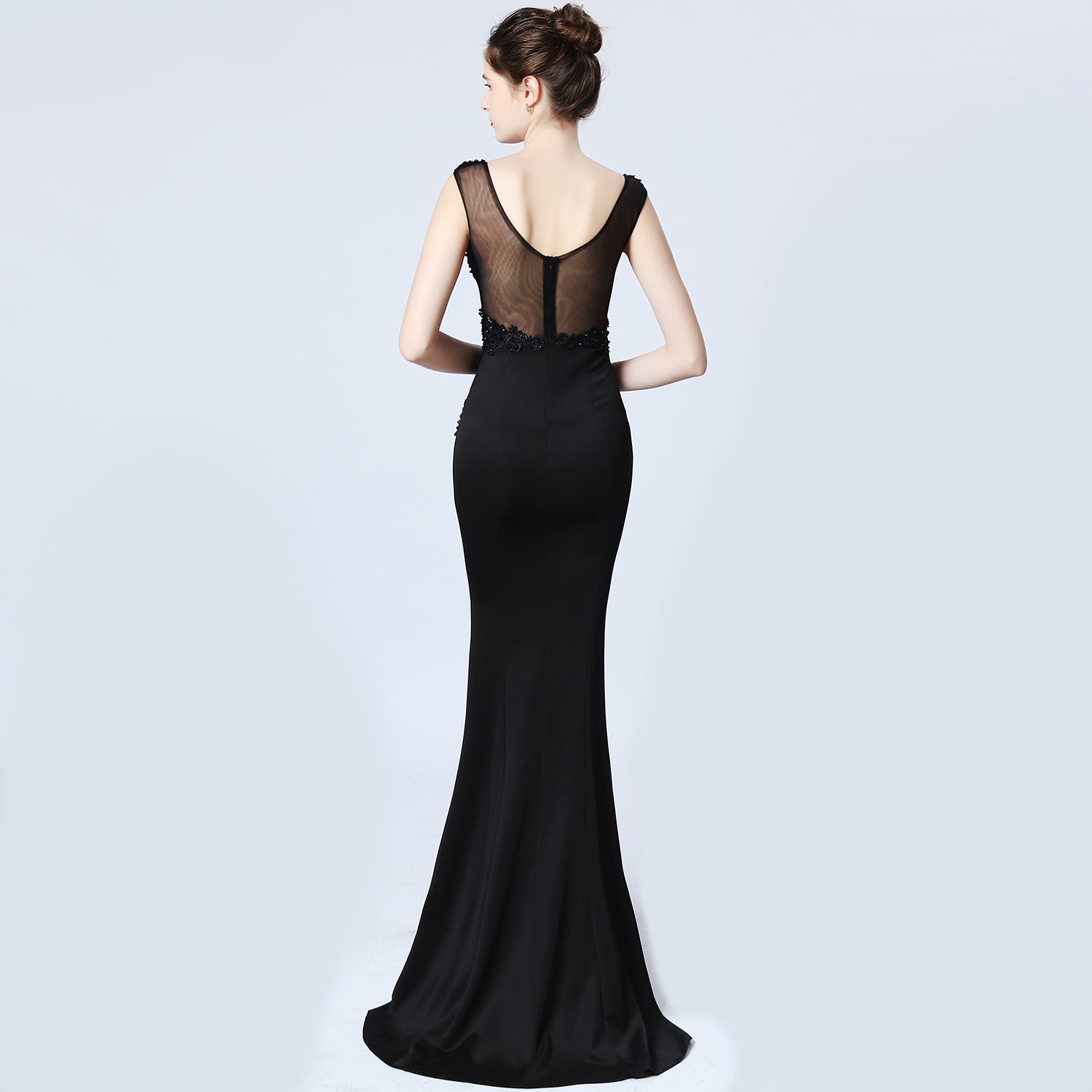 Command attention with the Seraphine Black Evening Gown, a timeless masterpiece featuring a sleeveless mermaid silhouette and deep V-neckline. The sophisticated bodice showcases intricate black floral lace applique and beaded embellishments, while the design expertly hugs the figure before gracefully flaring at the hem. This expertly crafted gown delivers unparalleled elegance for formal events, galas, black-tie weddings, and red carpet appearances, ensuring you make a memorable statement with effortless sophistication.