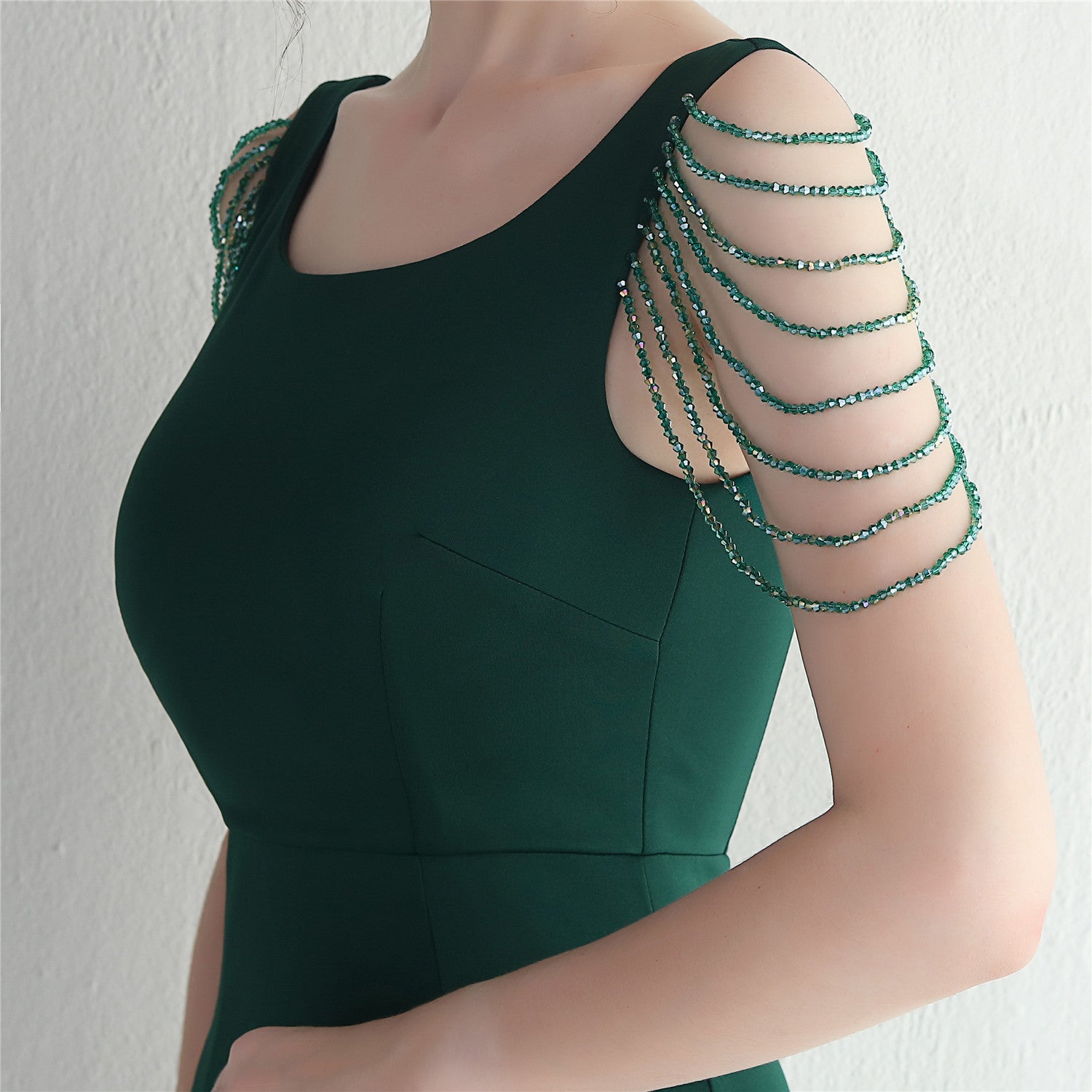 Serene is an expertly crafted emerald green cocktail dress that combines timeless elegance with modern flair. Its body-contouring fit and scoop neckline enhance your silhouette, while the subtly flared hem adds graceful movement. The standout feature —shoulders adorned with cascading beaded chains —introduces a sophisticated touch of glamour. Made from high-quality stretch fabric, Serene ensures both comfort and style, making it ideal for evening events and weddings. Pair with heels and minimal accessories to highlight its unique design.